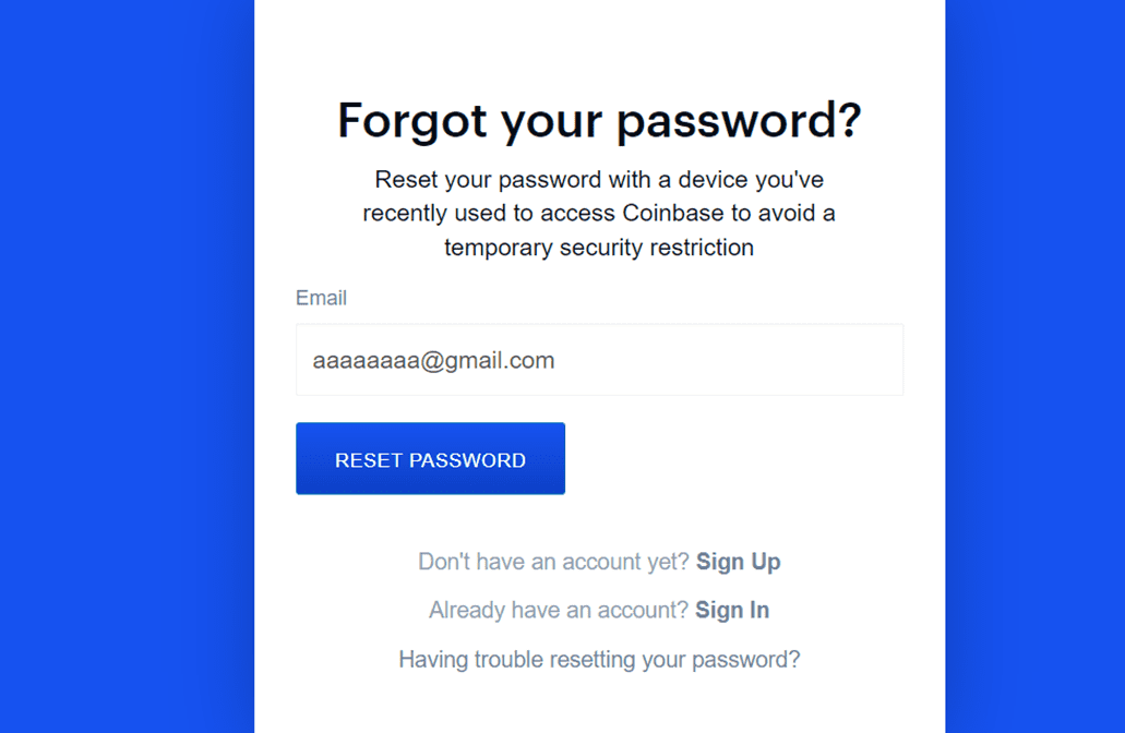 2. Geben Sie die mit Ihrem Coinbase-Konto verknüpfte E-Mail-Adresse ein und wählen Sie Password Reset (Zurücksetzen des Passworts), um eine E-Mail zu erhalten.