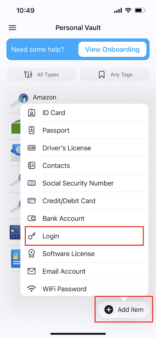 2. Um ein neues Element zu erstellen, klicken Sie auf die Schaltfläche Add Item (Element hinzufügen) und wählen Sie das erforderliche Element aus, z. B. Login.
