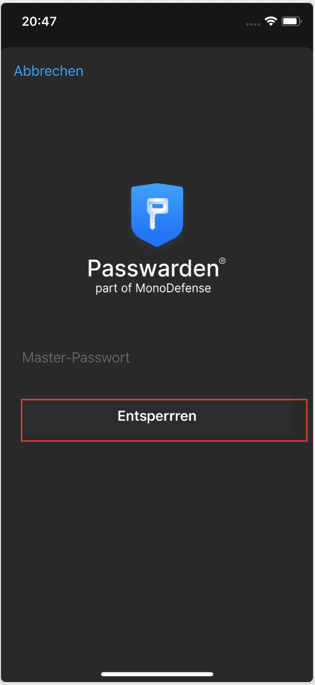 2. Tippen Sie auf diesen Tastaturvorschlag und entsperren Sie unseren sicheren Passwort-Manager mit Master-Passwort oder biometrischen Zugangsdaten.