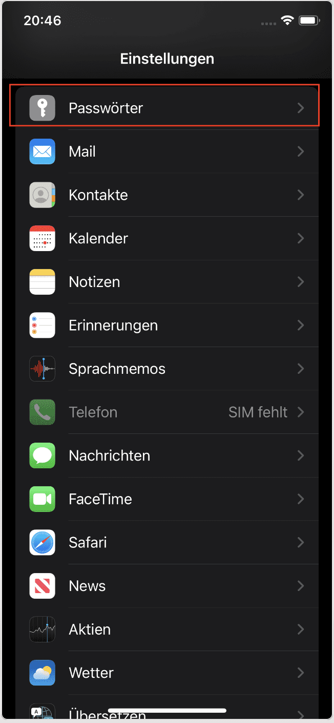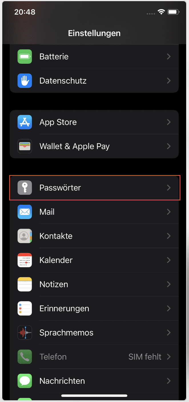 Öffnen Sie die Registerkarte Passwords & Accounts (Passwörter & Konten) oder Passwords (Passwörter). Der Name kann je nach iOS-Version abweichen.