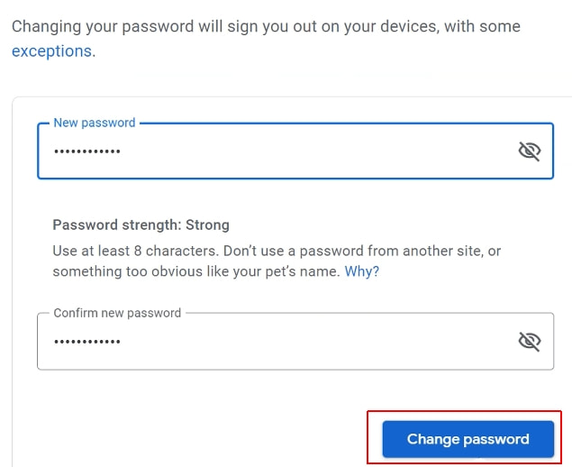 6. Escribe tu nueva contraseña (dos veces) y haz clic en Change password (Cambiar contraseña).