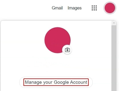 2. Para cambiar tu contraseña, primero haz clic en el círculo de color situado en la esquina superior derecha de la pantalla y selecciona Manage your Google Account (Administra tu cuenta de Google) en el menú desplegable.