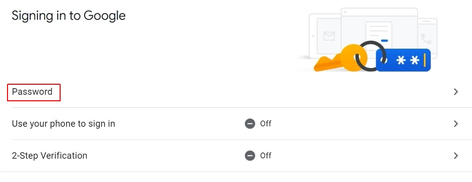 4. Desplázate hacia abajo hasta encontrar el cuadro Signing in to Google (Iniciar sesión en Google). Haz clic en Password (Contraseña).