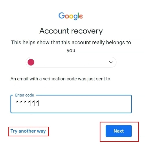 4. A continuación, Google enviará un código de verificación al correo electrónico que utilizaste para registrar tu cuenta (el código 111111, mostrado en la captura de pantalla a continuación, es solo un ejemplo, no es un código real). Introduce el código que recibiste y haz clic en Next (Siguiente). También, puedes hacer clic en el enlace Try another way (Probar otro método). Esto último hace que se te envíe el código a tu teléfono móvil.
