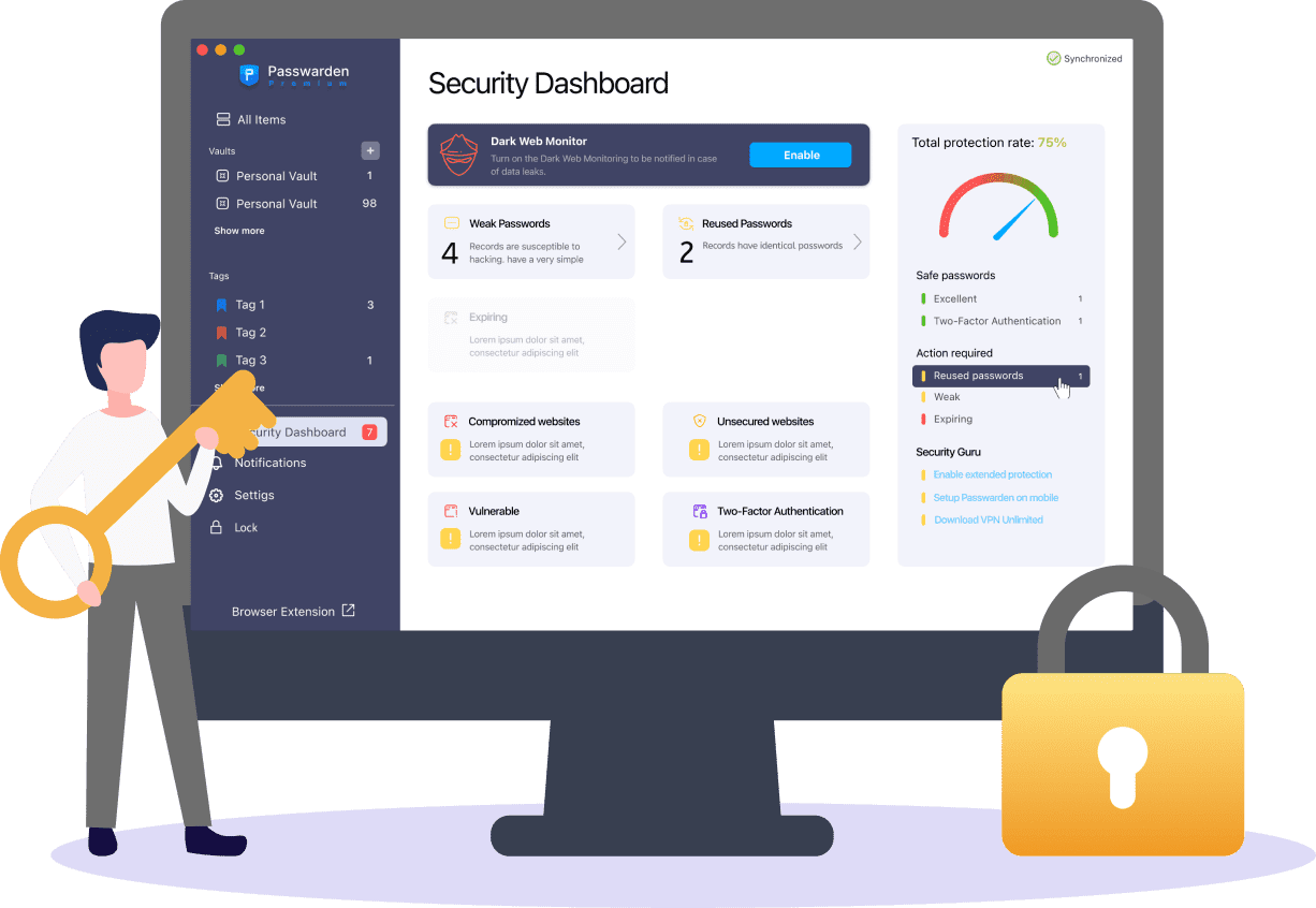 That’s why you need Passwarden. Our Security Dashboard feature will keep you aware of all the exterior threats and data breaches that can influence your password safety. Let’s have a closer look at the reasons why you need our solution and how it works. Let’s overcome the vulnerabilities with Passwarden.