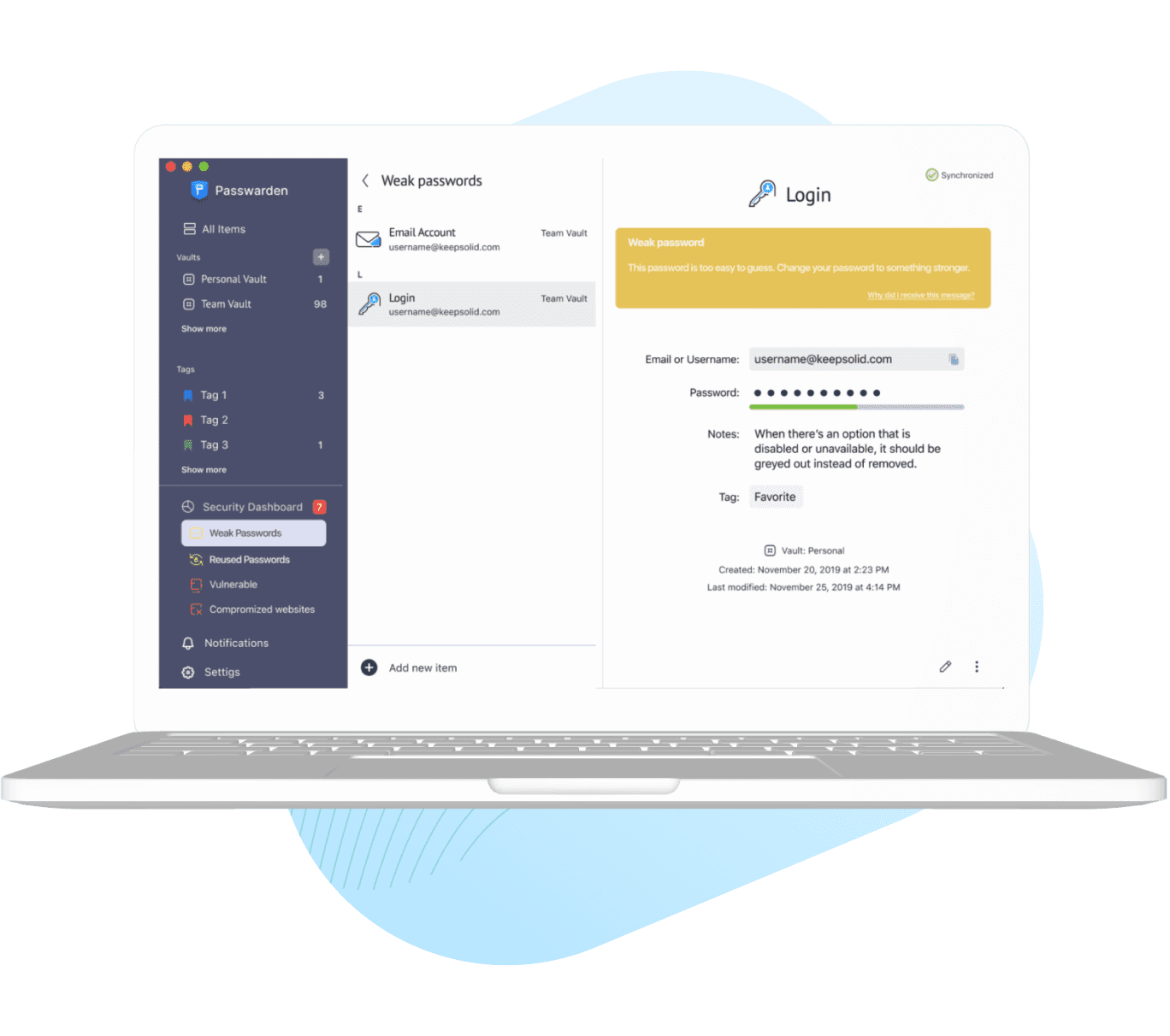 If your password is considered weak, you will be advised to change it creating another strong and safe combination of characters. Check out this page to learn how to generate strong passwords with Passwarden.