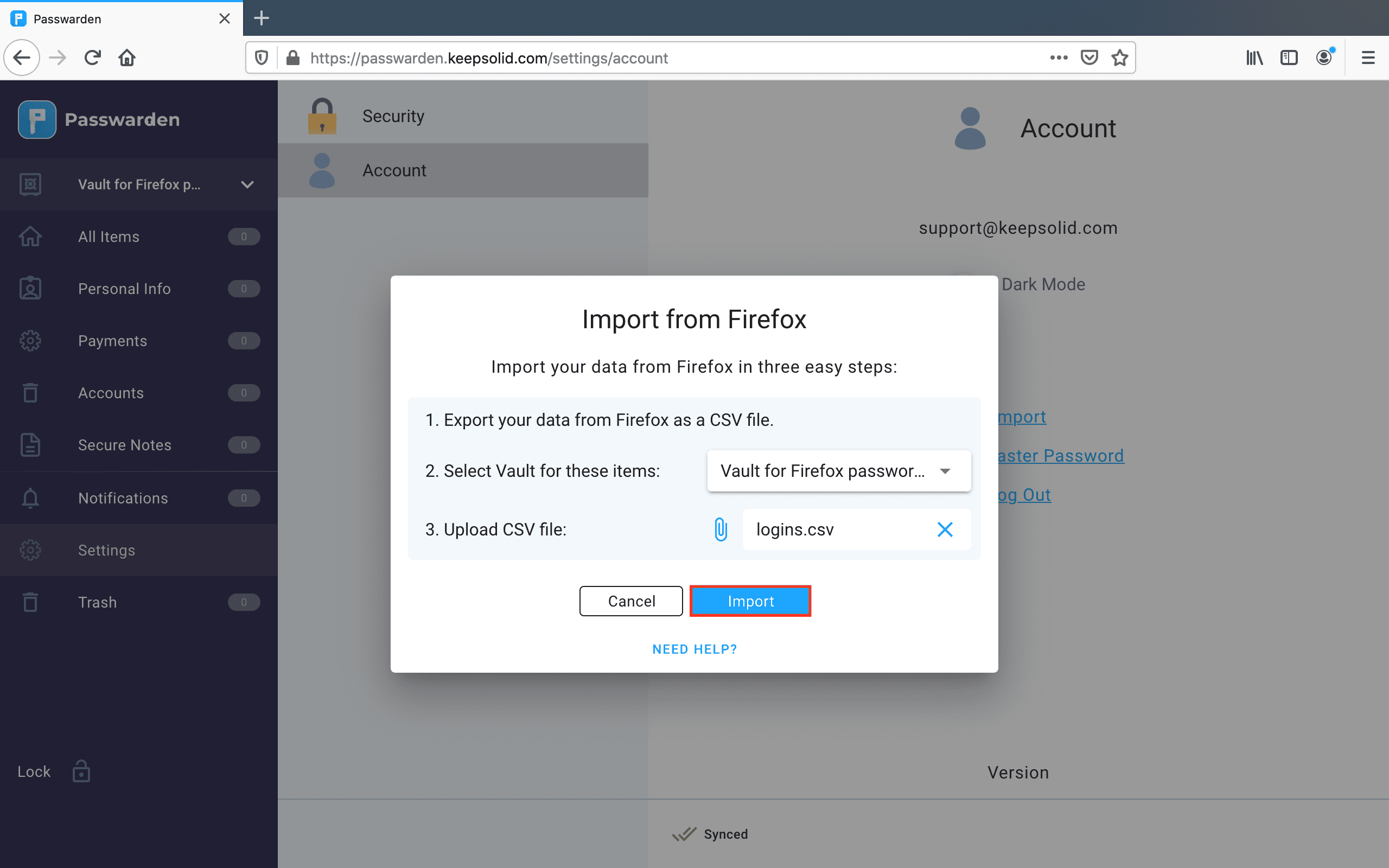 Génial! Il ne vous reste plus qu'à importer le fichier téléchargé sur votre compte Passwarden et c'est tout.
