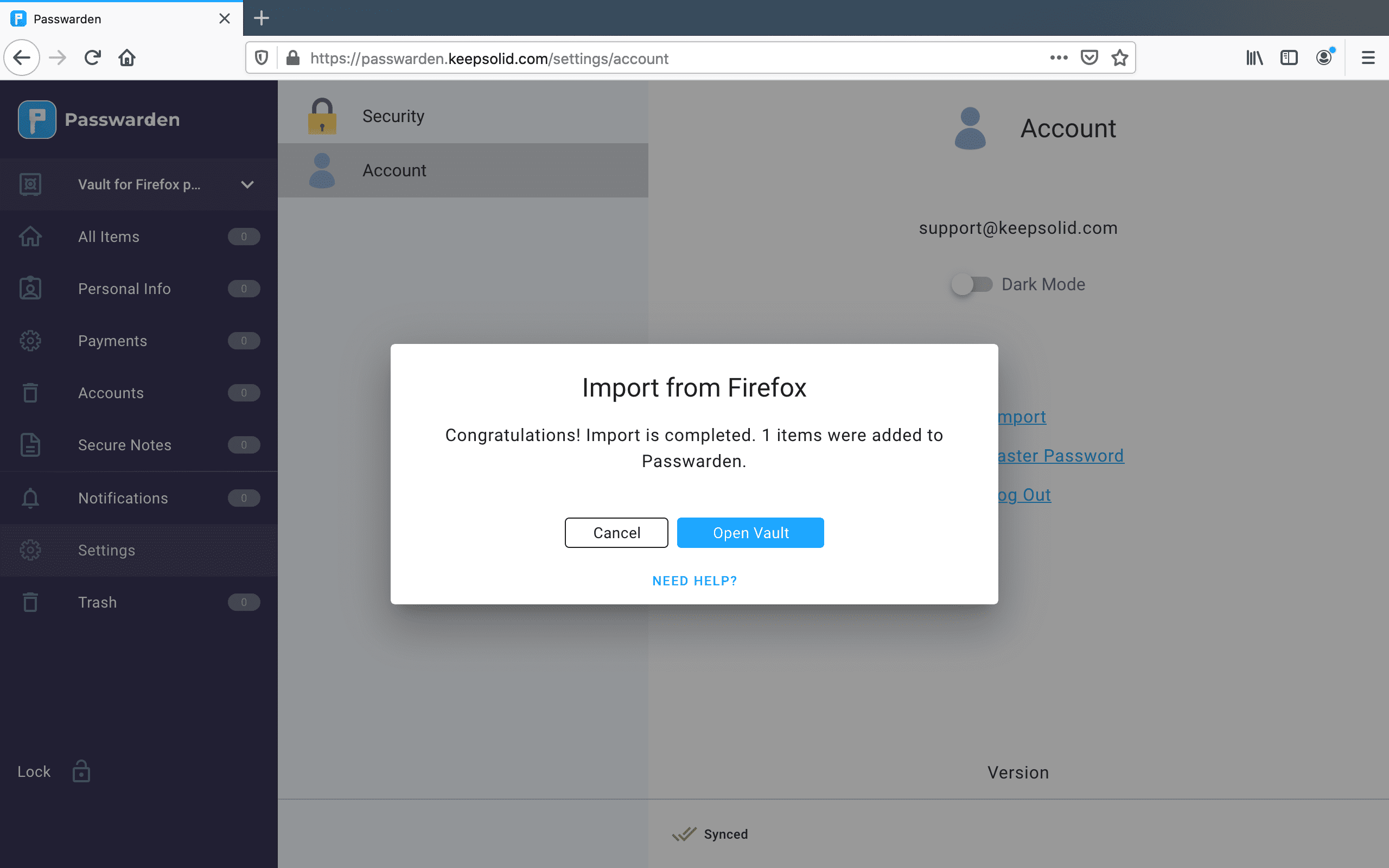 Félicitations! Vous avez réussi à exporter tous vos mots de passe Firefox et à les importer dans l'application Passwarden.