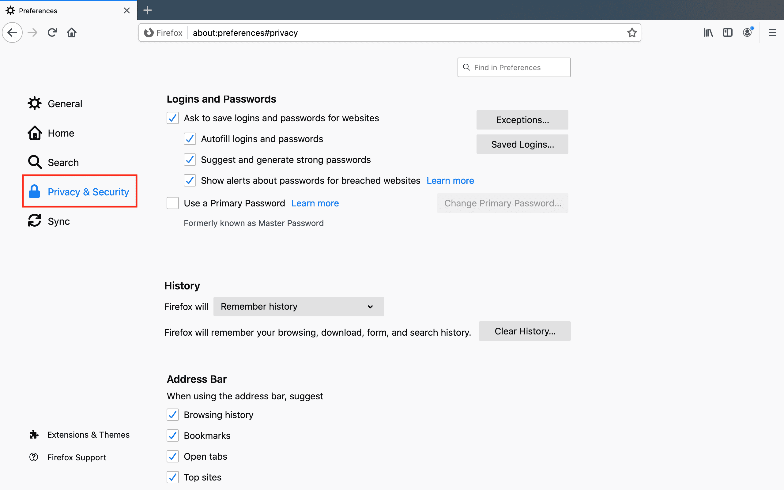2. Allez dans l'onglet Privacy & Security (Confidentialité et Sécurité) et faites défiler la page jusqu'à la section Logins and Passwords (Identifiants et mots de passe).