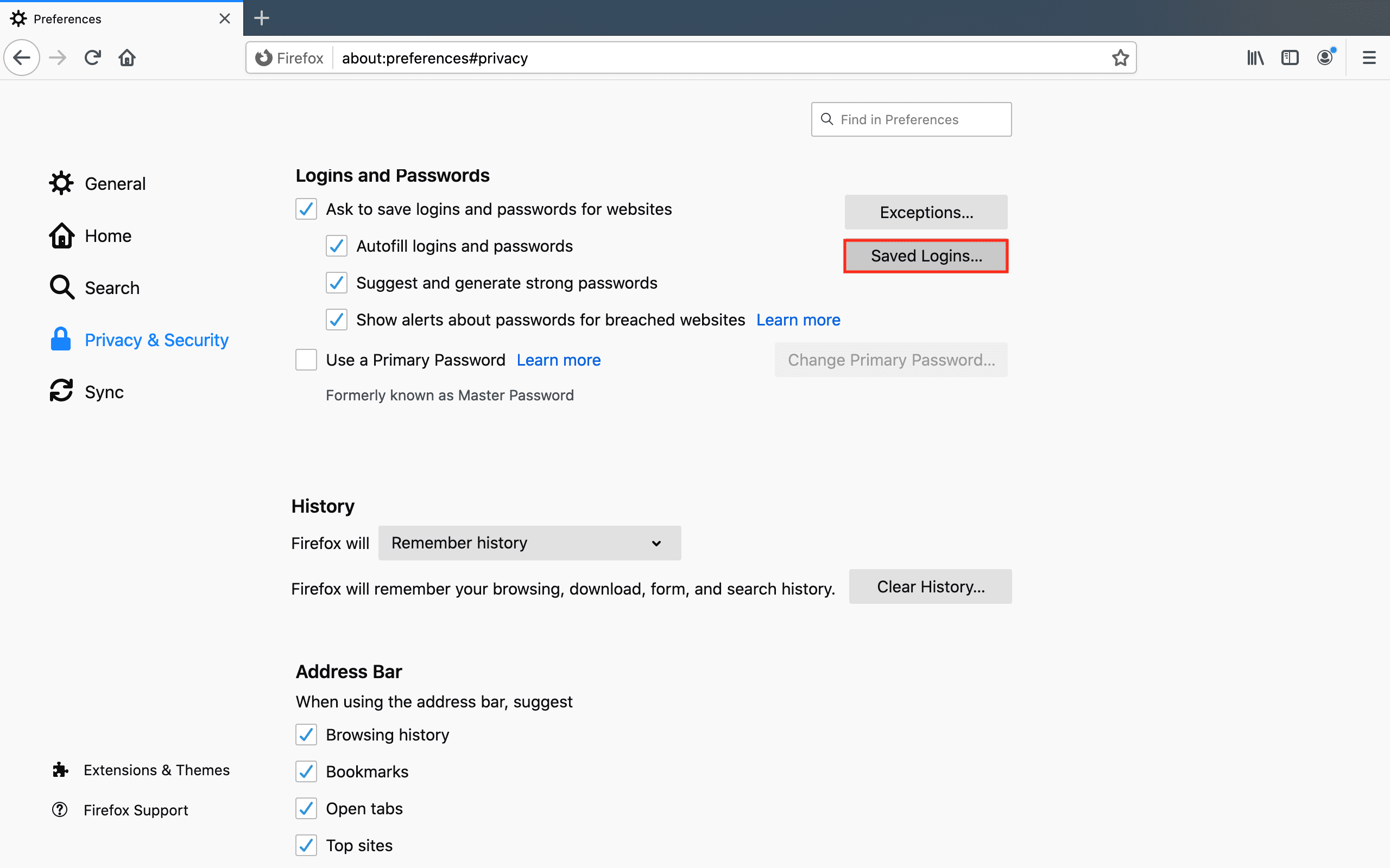 3. Cliquez sur Saved Logins… (Identifiants sauvegardés)