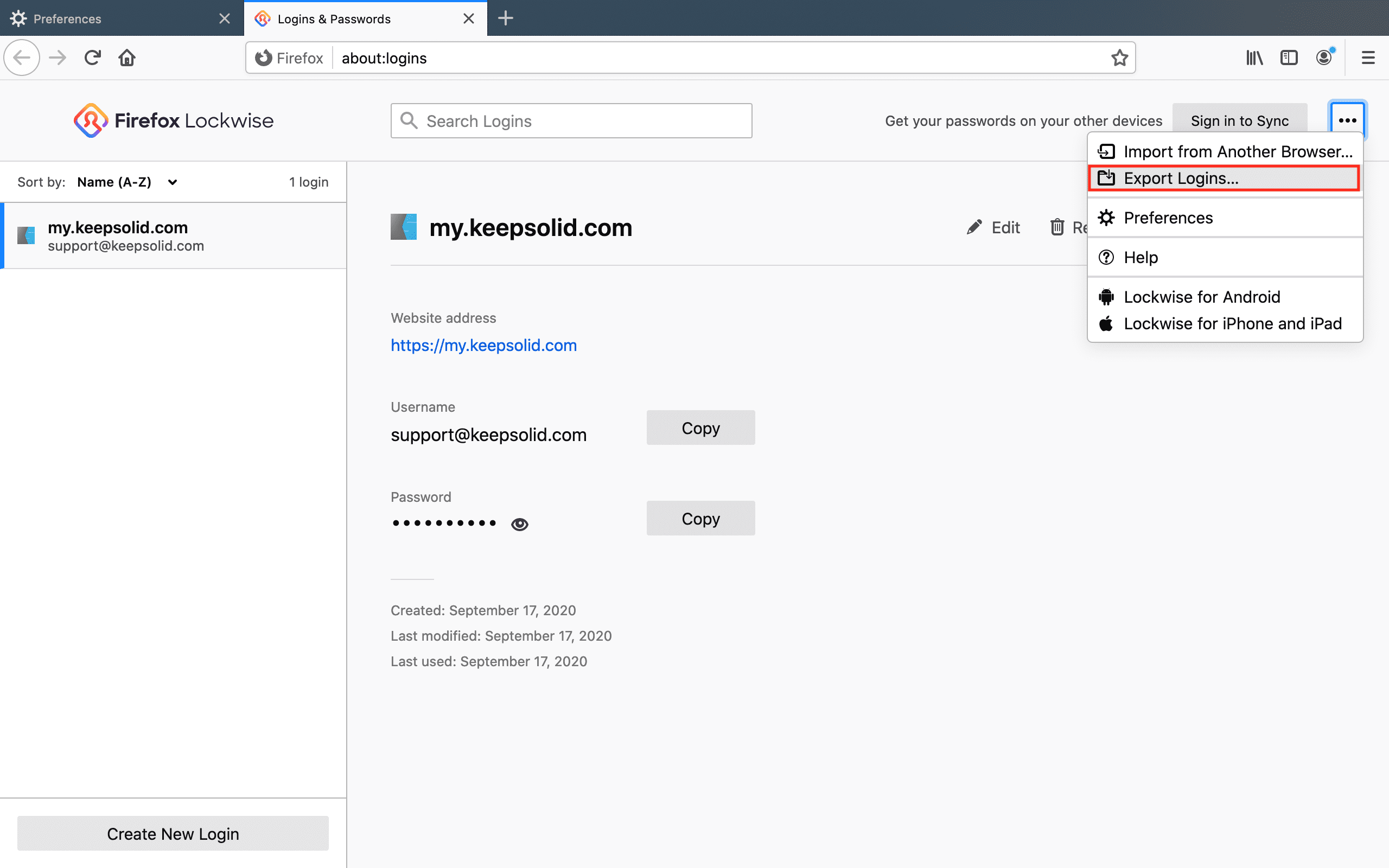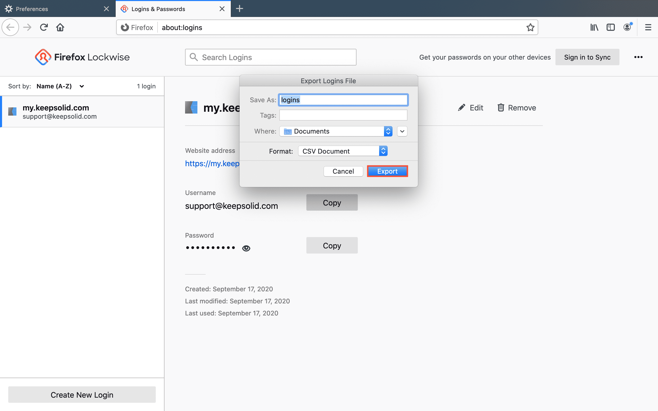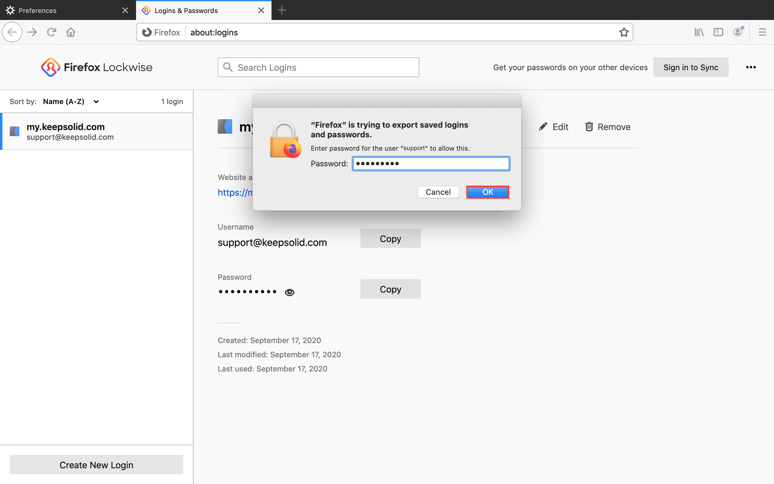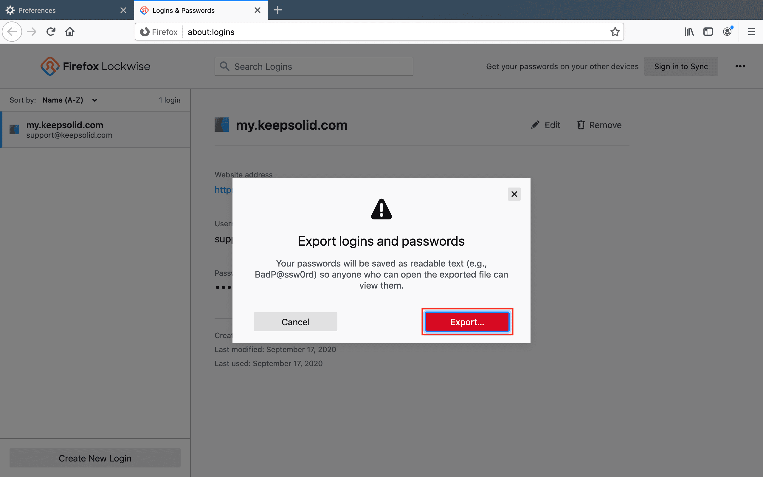 5. Cliquez sur Export… (Exporter) et confirmez votre mot de passe.