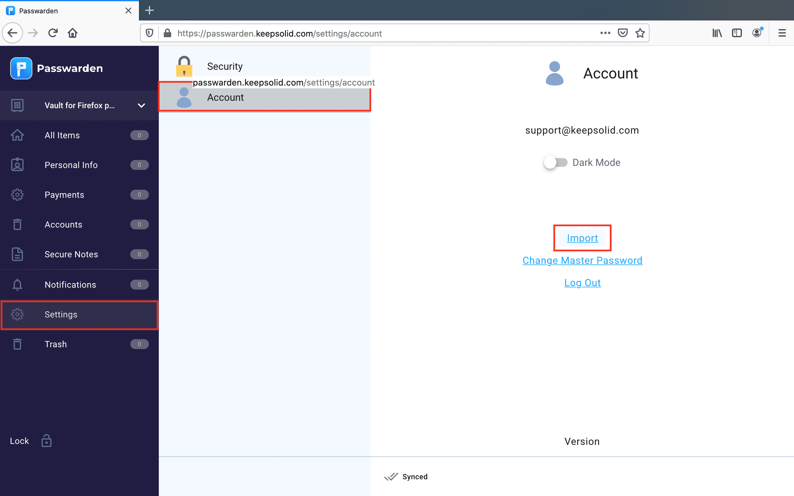 1. Ouvrez l'application Passwarden. Allez à Settings (Paramètres) > Account (Compte) > Import (Importer).