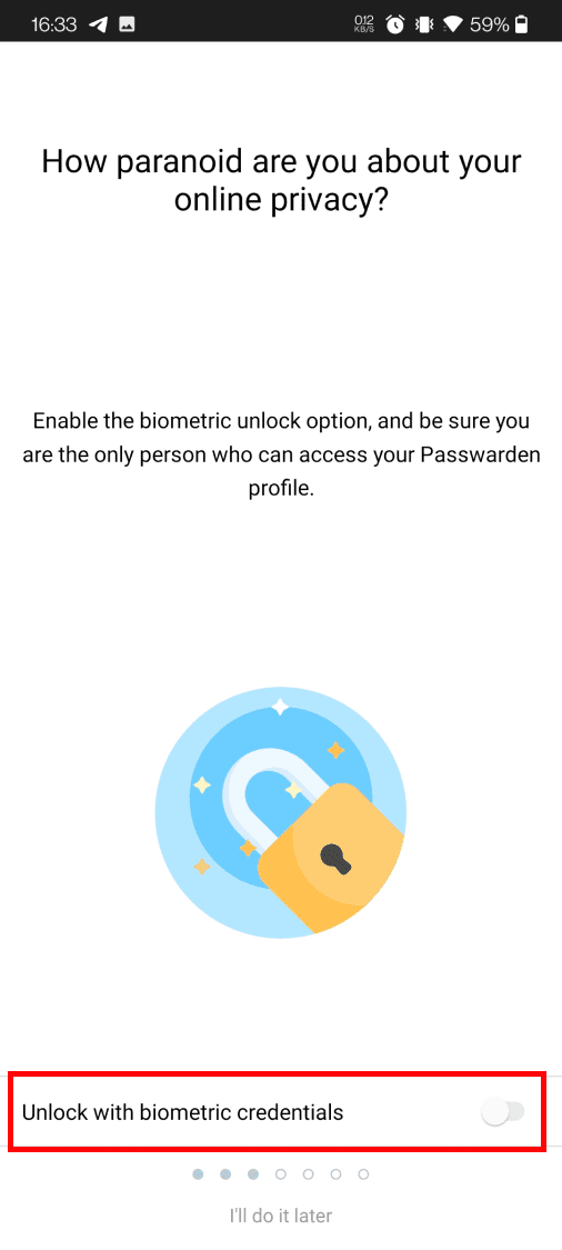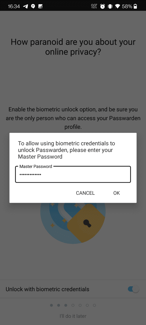 4. Si votre dispositif Android est doté d'une fonction de déverrouillage par empreinte digitale, vous pouvez activer l'option de déverrouillage biométrique à la place de votre Mot de passe maître.