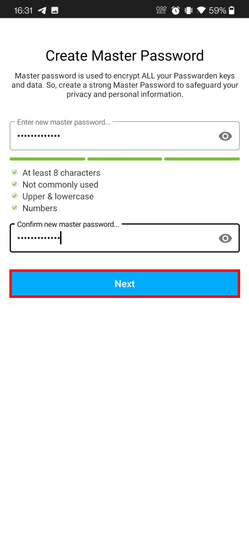 2. Vous devez maintenant créer votre nouveau Mot de passe maître. Après l'avoir confirmé, appuyez sur Next (Suivant).
