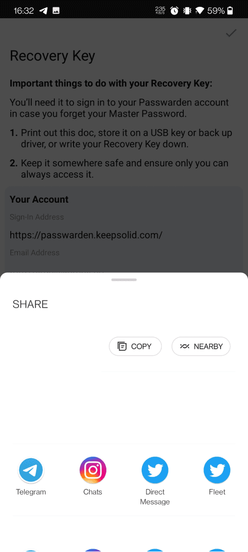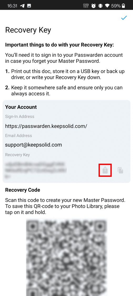 3. Sur l'écran suivant, vous pouvez voir votre Clé de récupération. Appuyez sur le bouton Sur l'écran suivant, vous pouvez voir votre Clé de récupération. Appuyez sur le bouton pour la sauver sur le Drive, les Notes, etc. Puis appuyez sur la coche dans le coin supérieur droit. pour la sauver sur le Drive, les Notes, etc. Puis appuyez sur la coche dans le coin supérieur droit.