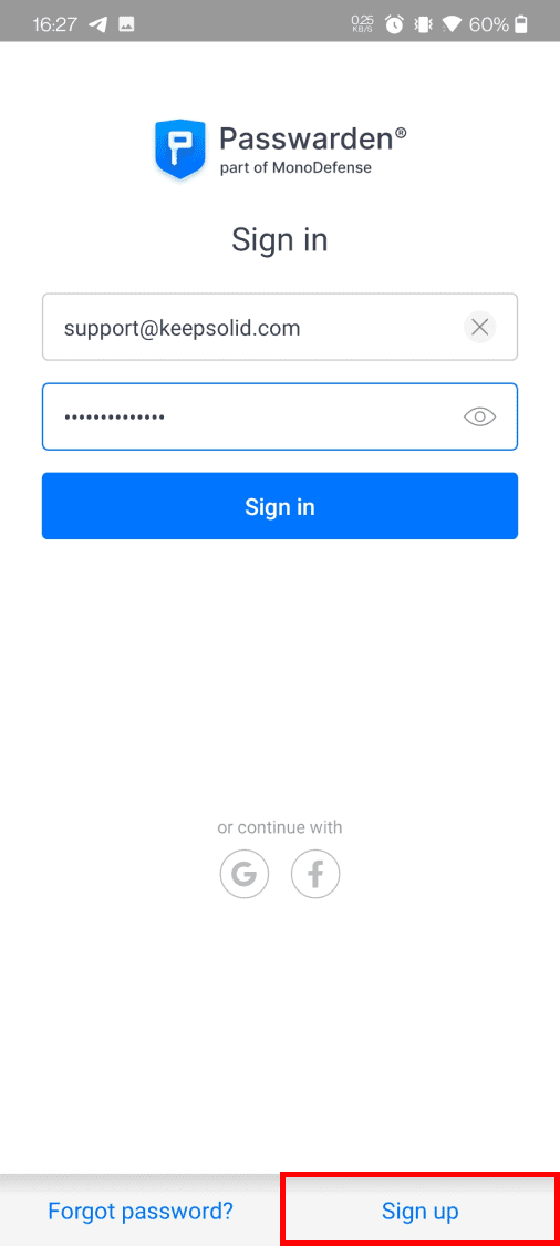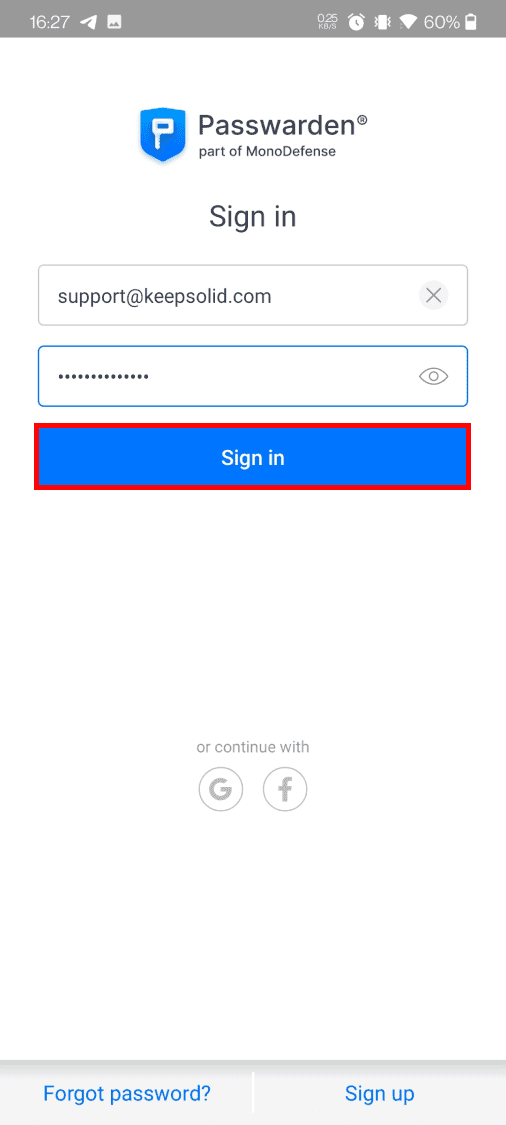 1. Si vous avez déjà un identifiant KeepSolid, il vous suffit de saisir votre adresse e-mail et votre mot de passe et d'appuyer sur le bouton Sign in (S’enregistrer). Vous pouvez également continuer avec un compte Facebook ou Google.