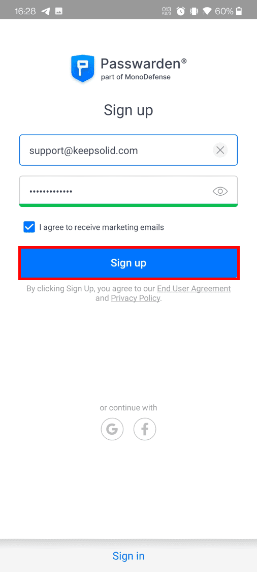 Pour créer un nouvel identifiant KeepSolid, appuyez sur Sign up (S’enregistrer), saisissez votre adresse e-mail et votre mot de passe, cochez la case à côté de I agree to receive marketing emails (J'accepte de recevoir des e-mails de marketing), puis appuyez sur le bouton Sign up (S’enregistrer).