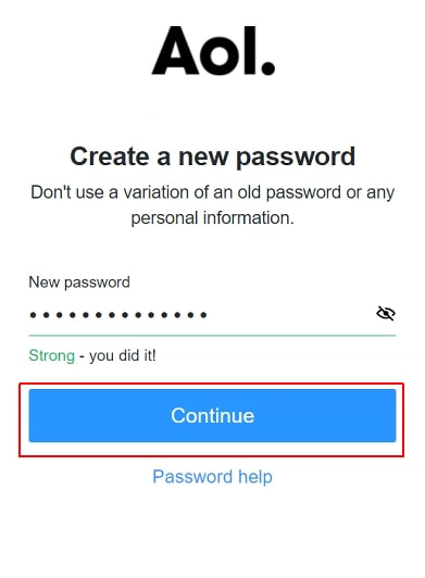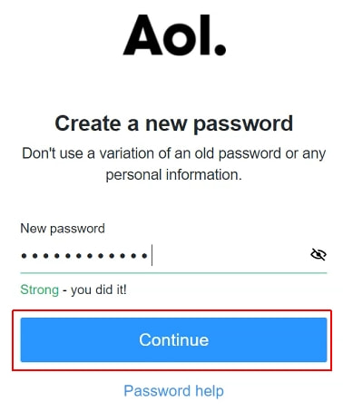 6. Now you are asked to create a new password. AOL automatically assesses whether it is strong enough or not. To create a truly unbreakable symbol sequence please use our in-depth guide. Click Continue when you have finished.