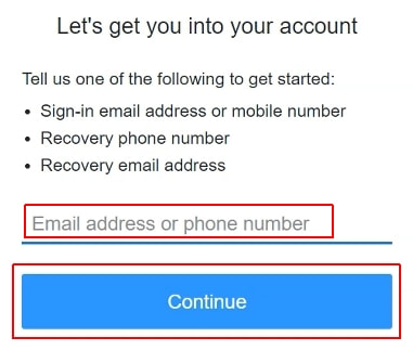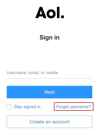 3. Enter your sign-in electronic mail address or mobile phone number. Only use the first part of the email, e.g. if your AOL mail is “user@aol.com” type in “user”. Click on Continue.
