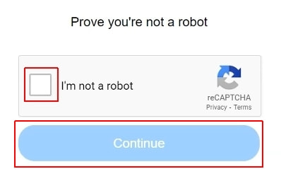 5. You now see a reCAPTCHA box asking to prove that you are not a robot. To do this, click the mouse on the small square on the left and then press Continue after this button has turned deep blue.