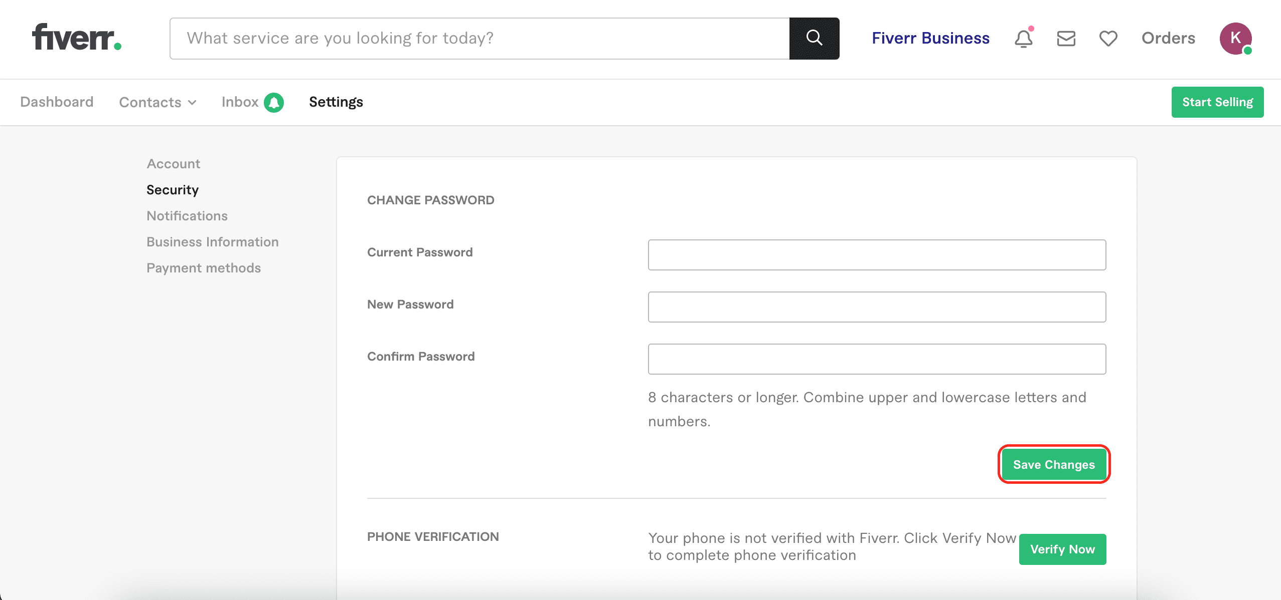 4. When you finish creating a solid password, just press Save Changes, this will replace your old Fiverr password with your newly created one. Thus, change your Fiverr password.