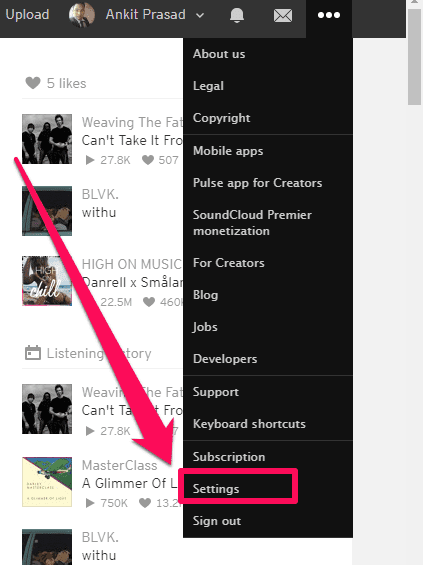 1. Click the three-dot icon in the upper right corner of the SoundCloud homepage, then Settings from the drop-down menu.