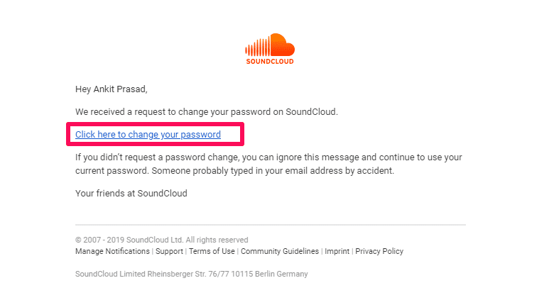 3. Make sure to check your emails, and the email ID would be the one you used when signing up with SoundCloud. If you use your Facebook account to sign in to SoundCloud, the password reset link will be emailed to the email address linked with your Facebook account. Keep a close eye out for an e-mail from SoundCloud with the subject “Request To Change *user’s name* SoundCloud Password”. To change your SoundCloud password, open the e-mail and click the link "Click here to change your password."