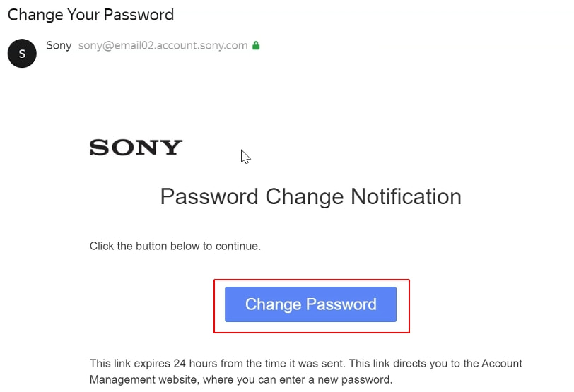 5. Go to your email box and open the letter sent by SONY. Its subject should be Change Your Password. Once you’ve opened the email, click on the Change Password button.