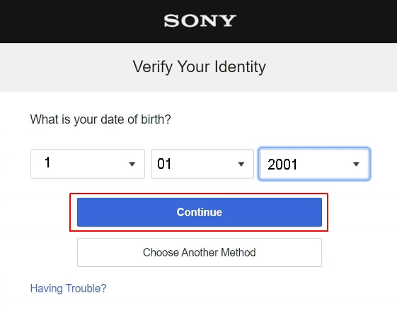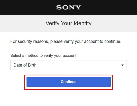 6. You are now asked to verify your identity. When you registered your PSN account you provided your date of birth; now you need to enter this same data. Click on Continue.