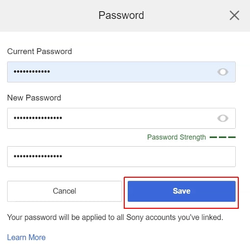 6. Enter your current PSN password (once), then type in the new one (you need to do it twice). PSN will automatically assess the strength of the combination. To create a truly unbreakable symbol sequence please use our in-depth guide. When you have finished, click on Save.