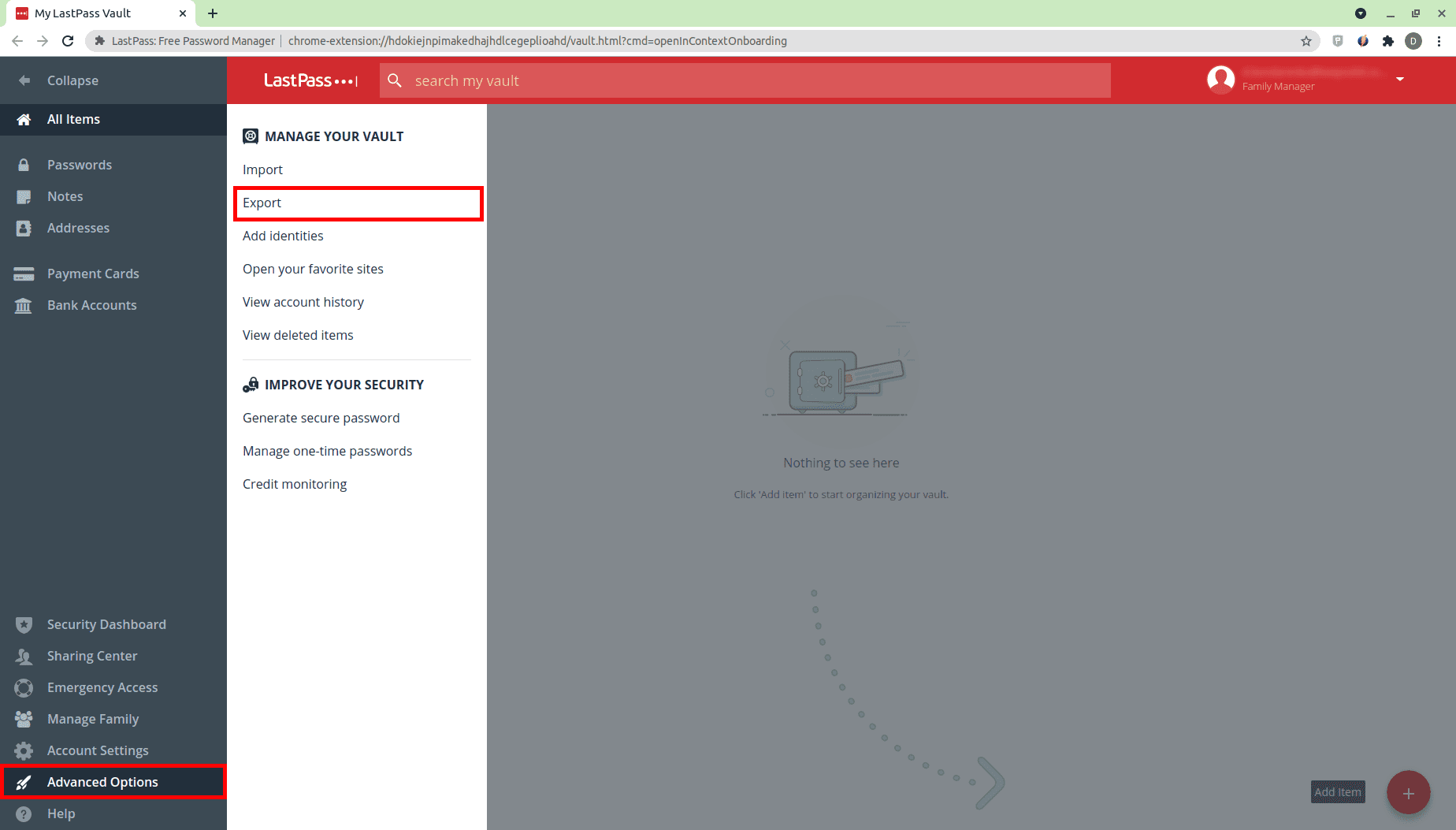 1. Open the LastPass browser extension and select Advanced Options > Manage Your Vault > Export.