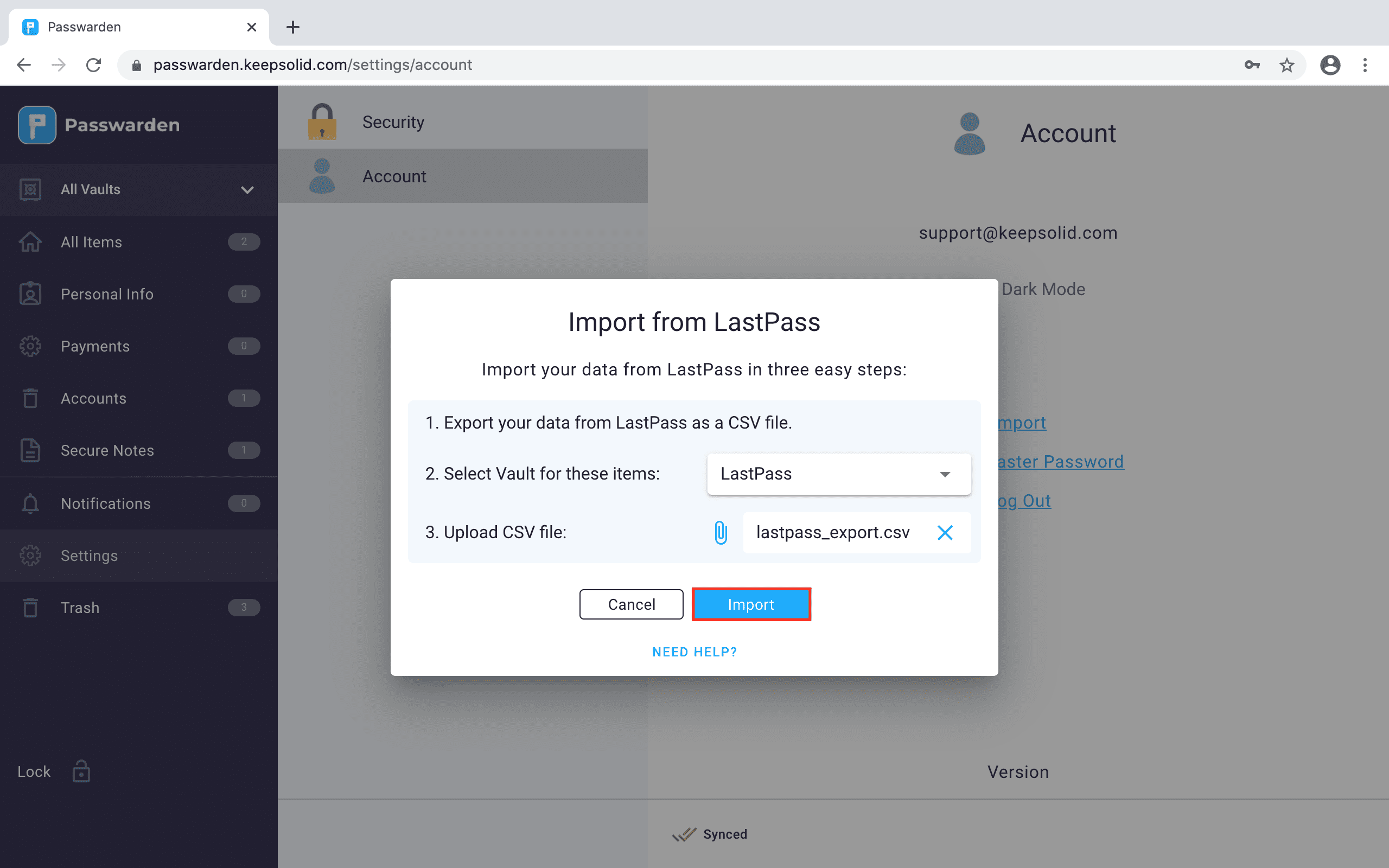 3. Select the Vault you want to import your data to and choose the .csv file you’ve exported from the LastPass. Press Import.
