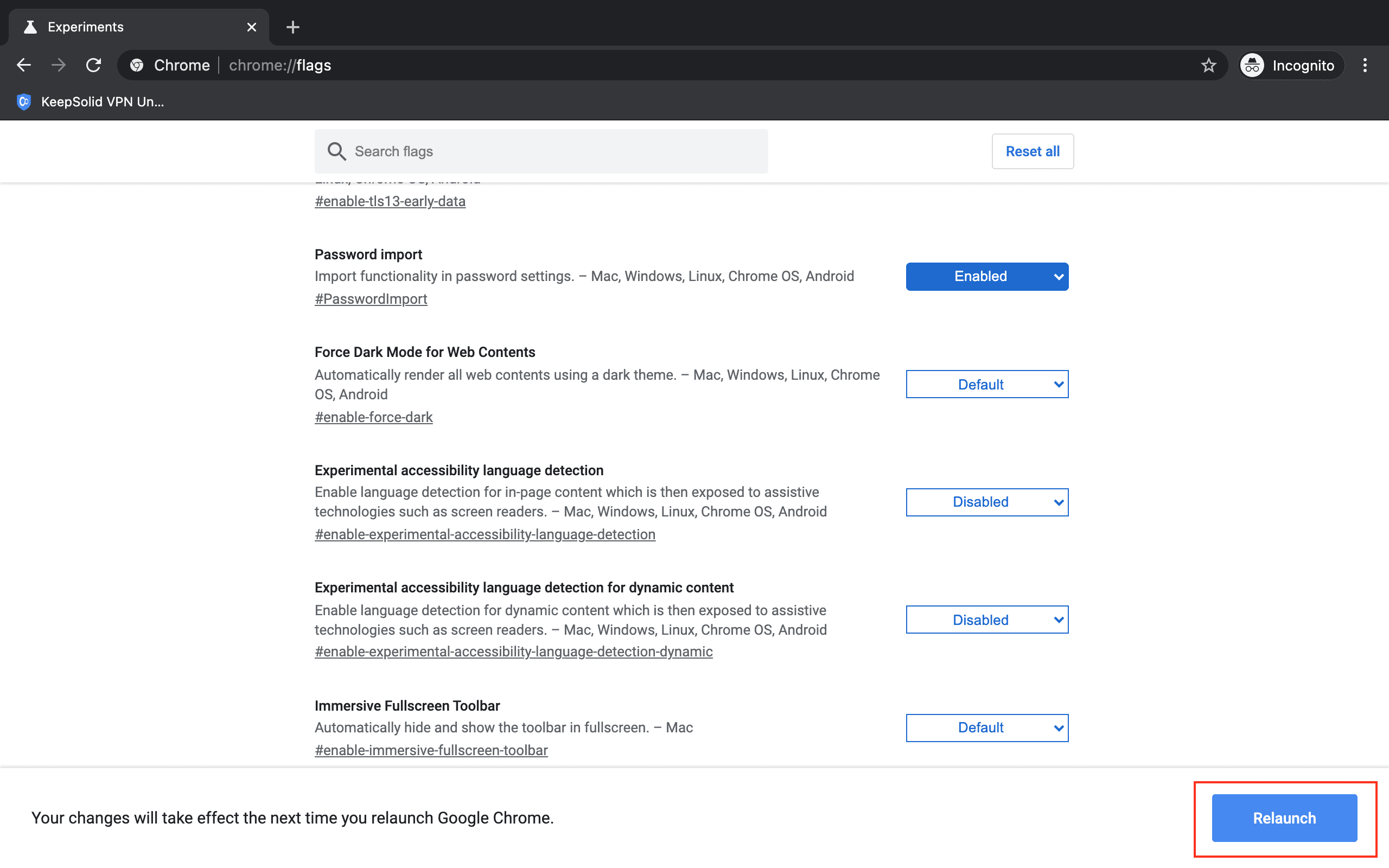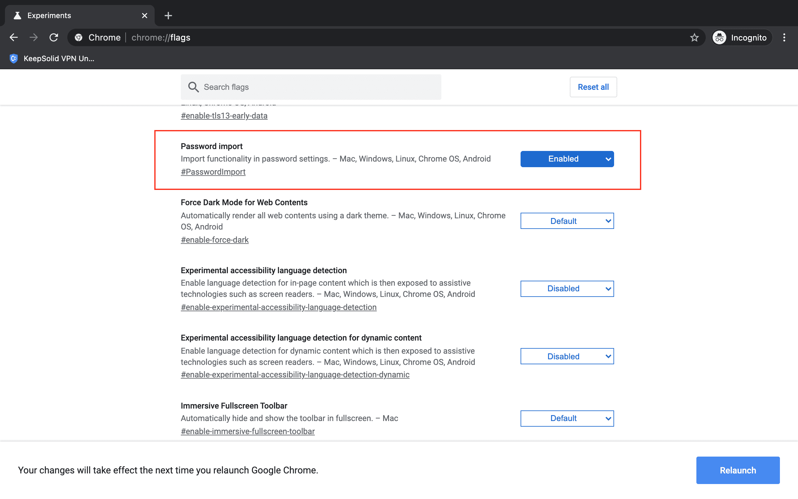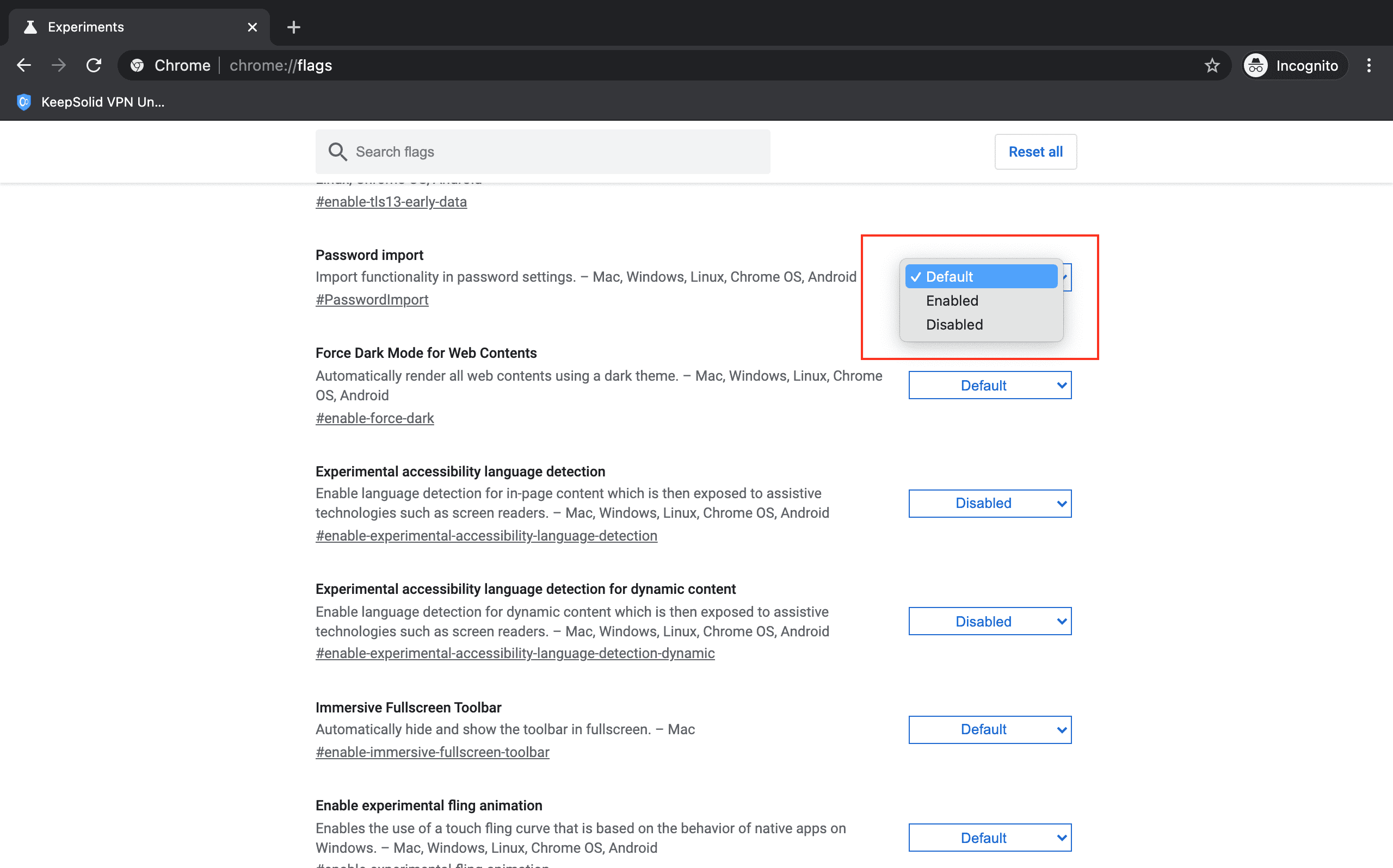 3. Scroll down to the Password import option and select Enabled by clicking the dropdown menu next to this option.