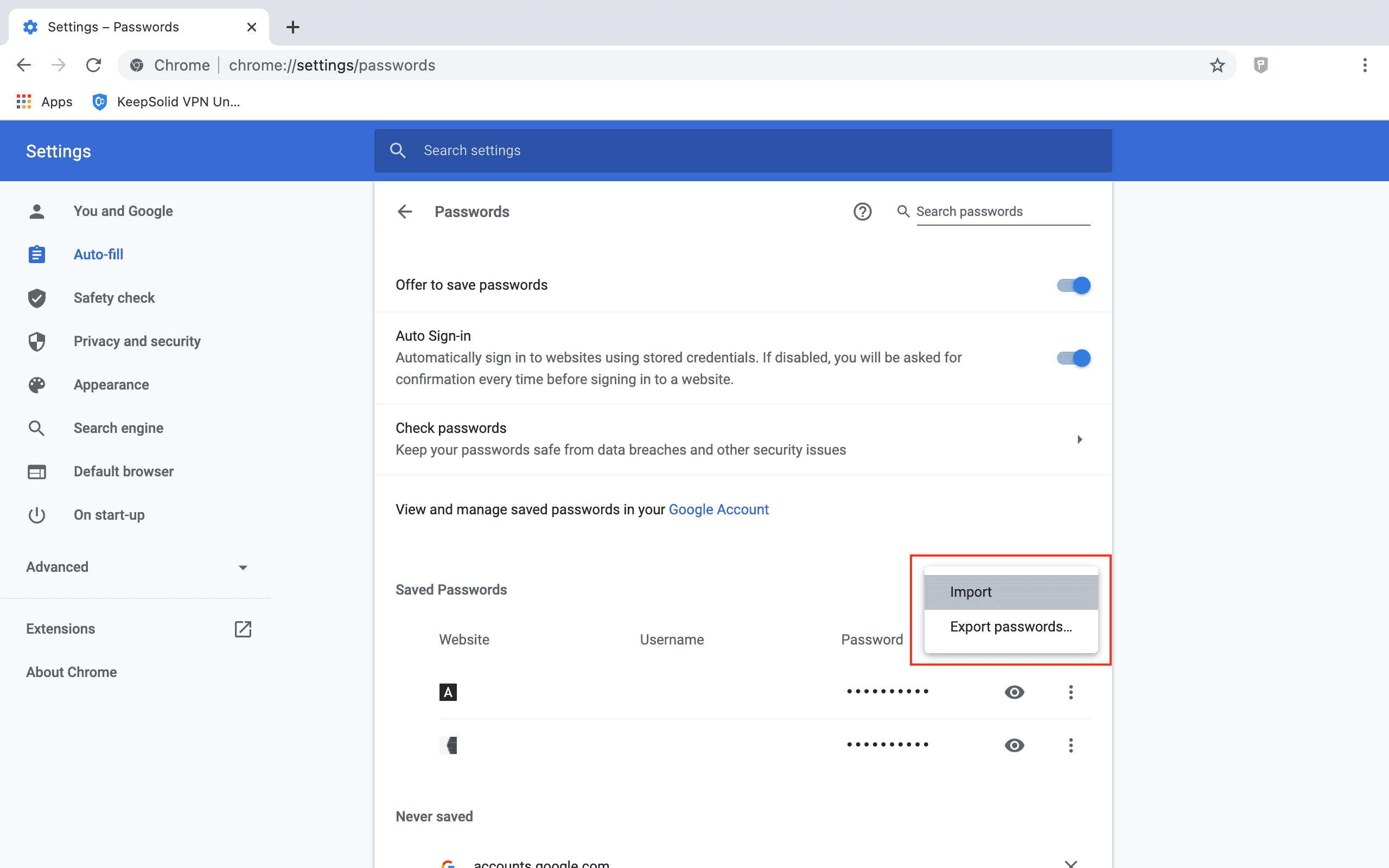 6. Open the Kebab menu next to Saved Passwords and select Import.
