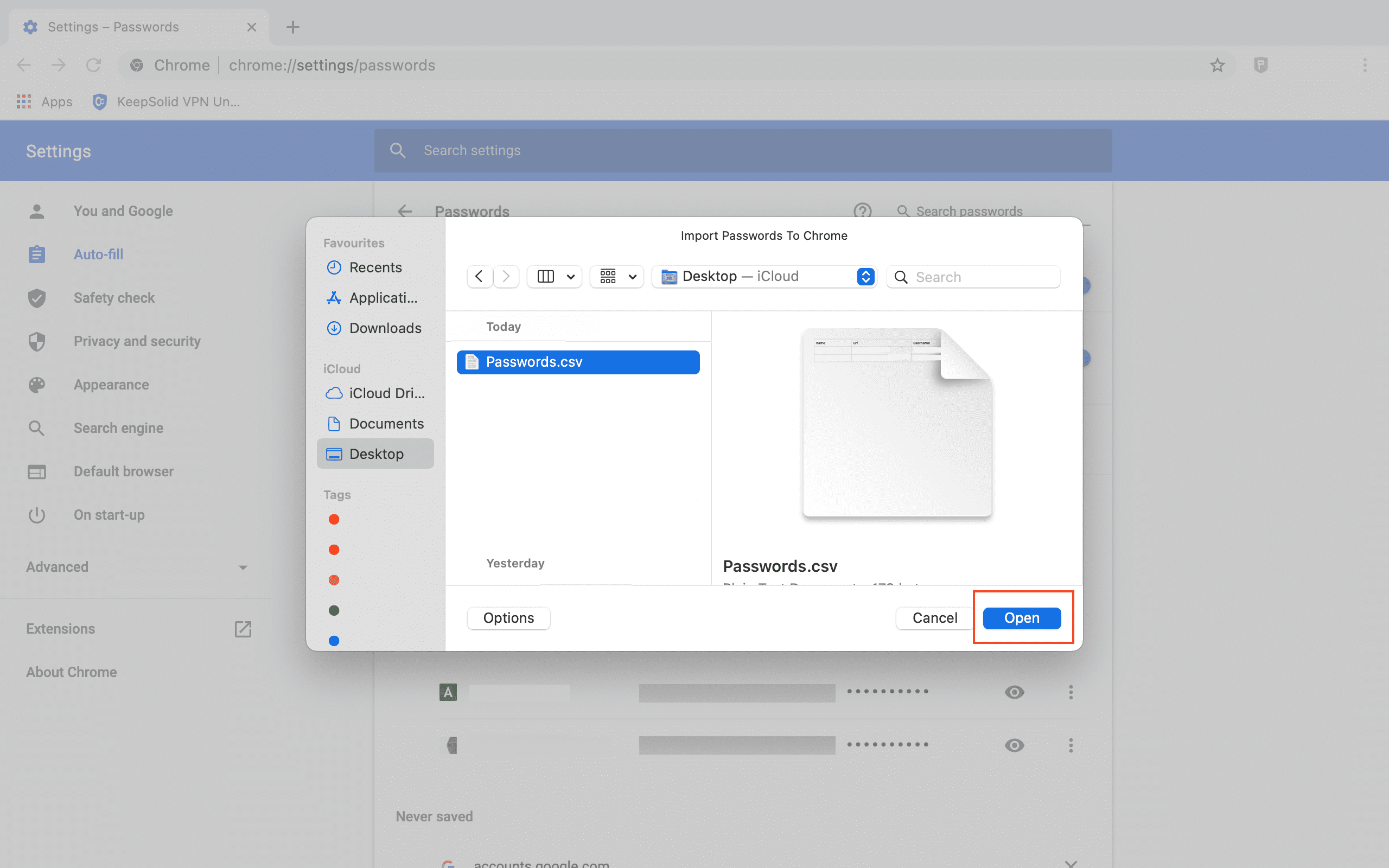 7. Navigate to your CSV passwords file and select it to import into Chrome.