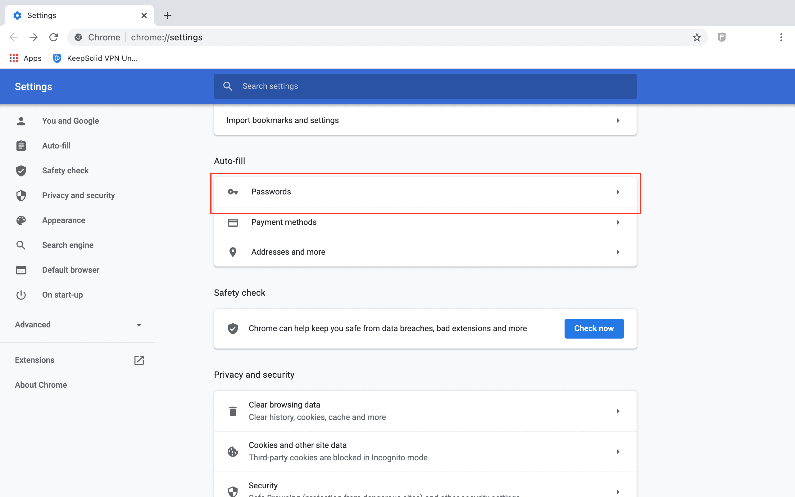 5. When Google Chrome opens, click the three dots in the top-right corner, and select Settings > Passwords on the following screen.