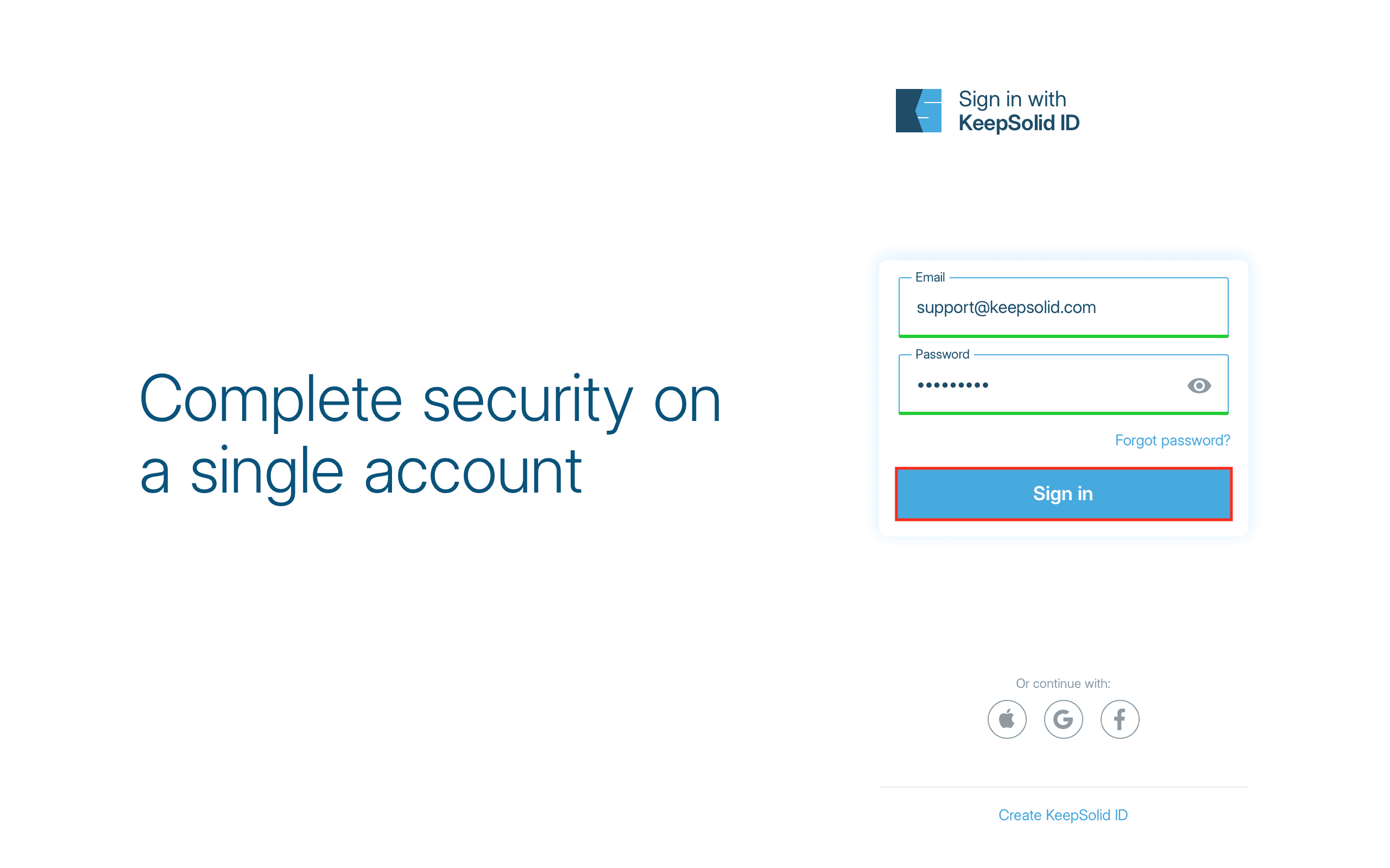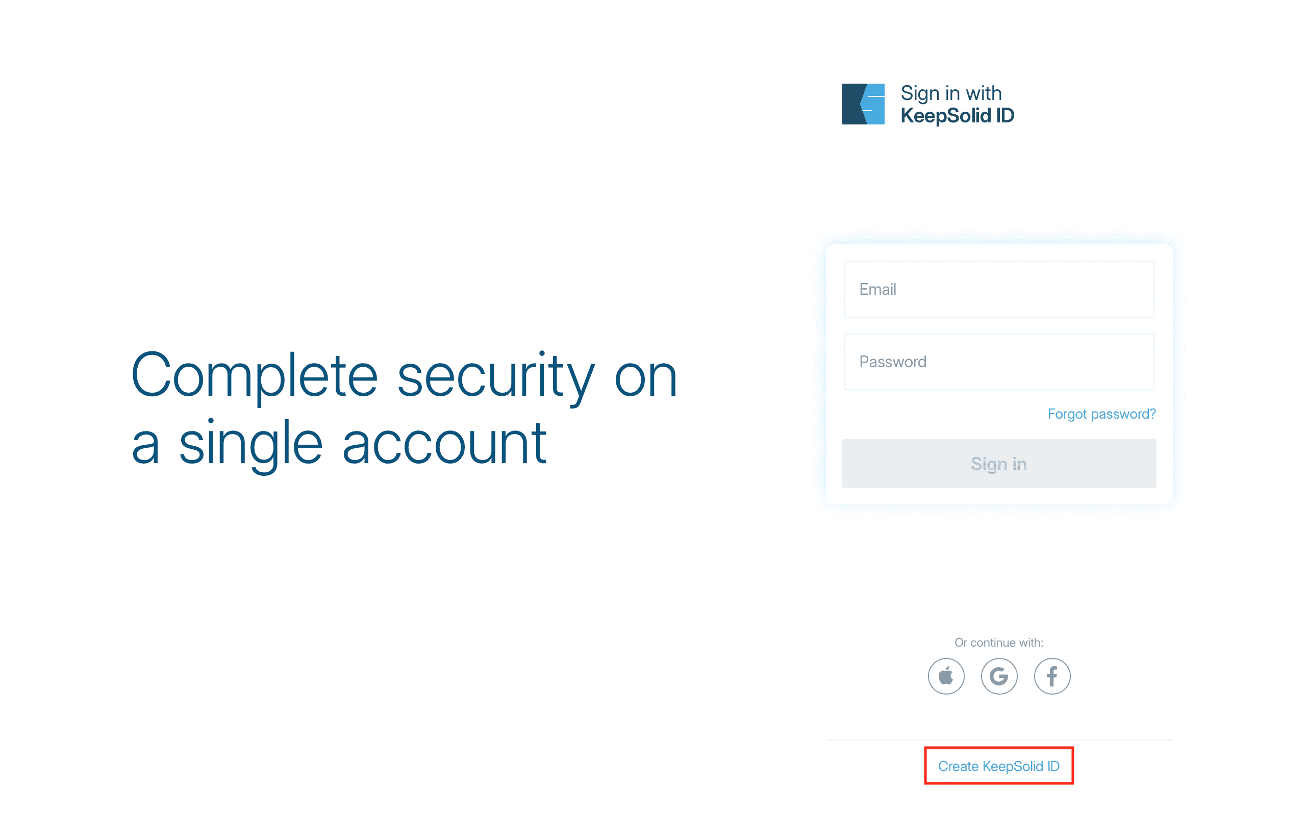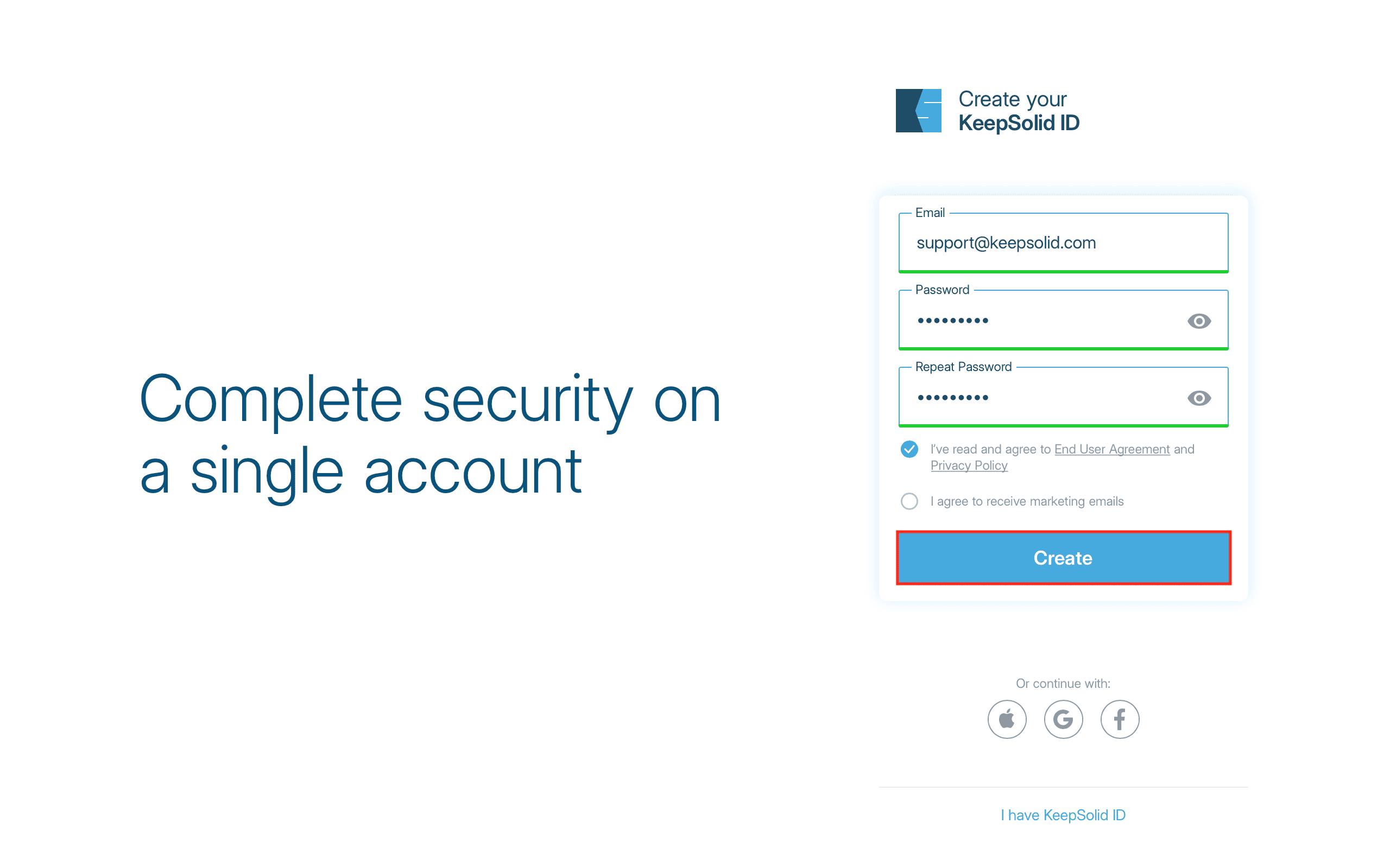 If you don't have a KeepSolid ID, you should create a new one. To do this, press Create KeepSolid ID and enter your email address and password. Confirm your password, check the box next to By continuing, you agree to our…, and click the Create button.