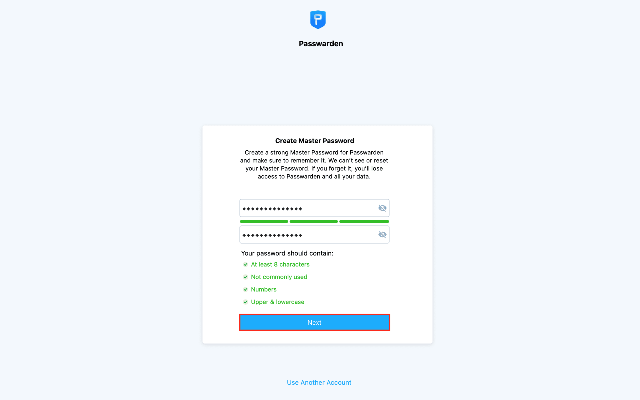 2. On the next step you should set up a Master Password - password for your Passwarden account. Confirm it and click the Next button.
