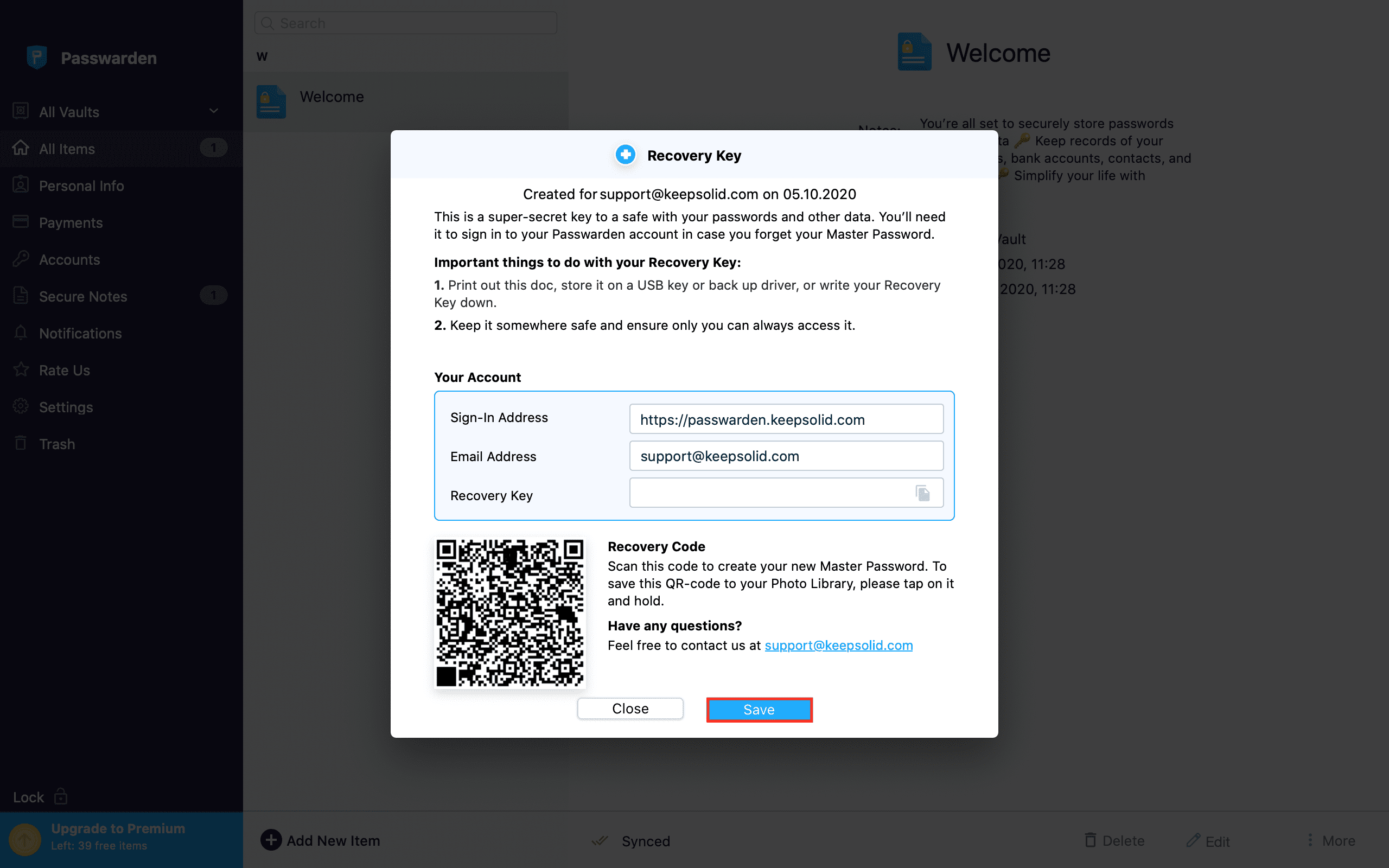 Note: If you forget your Master Password, you’ll need this Recovery Key to sign in your Passwarden account. So make sure to save it in a secure place.