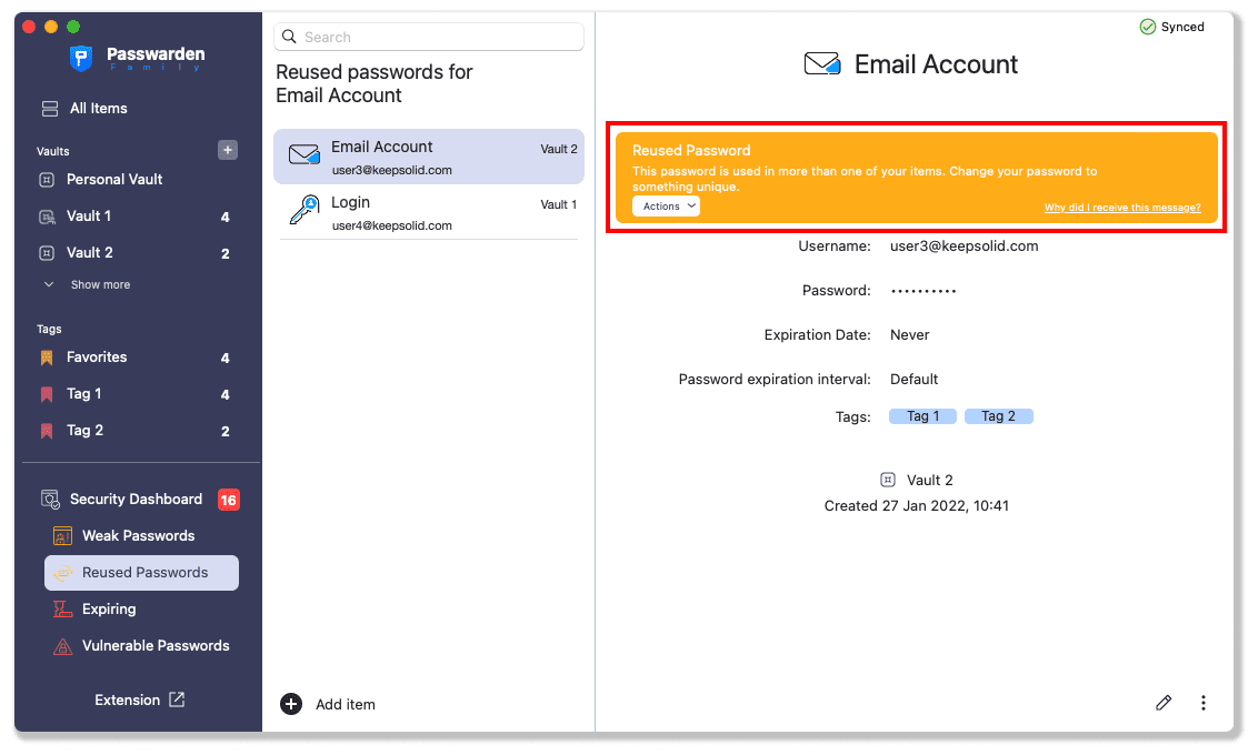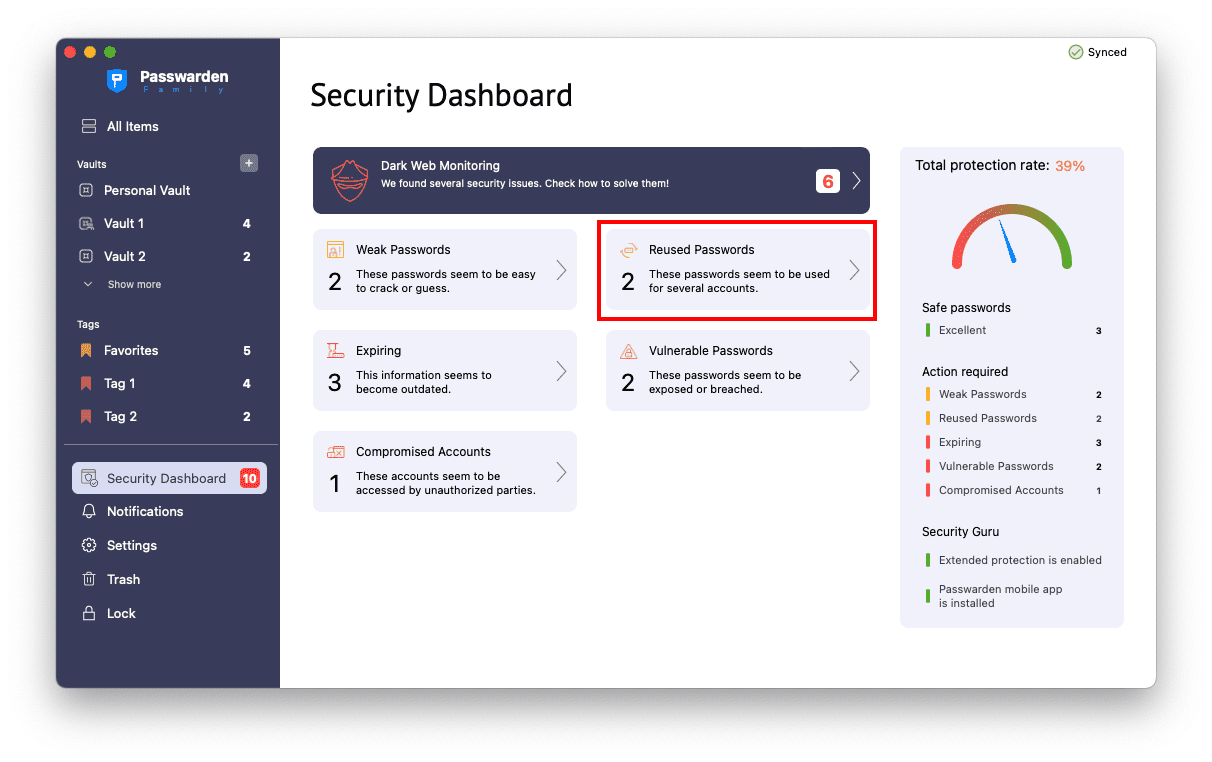 Passwarden allows you to prevent this. With Security Dashboard all vulnerabilities and weak links can be easily detected and fixed. You will show all the statistics of weak, reused, or compromised passwords you have. Let’s become a strong cell in the system of cybersecurity.
