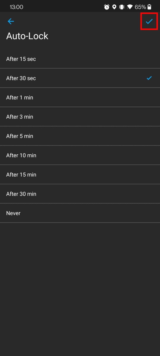 2. Choose the appropriate auto-lock time and tap Save in the right upper corner.