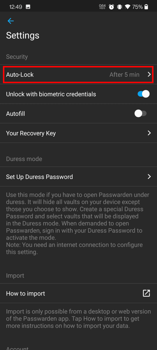 1. Go to Settings and select the Auto-Lock option in the Security section.
