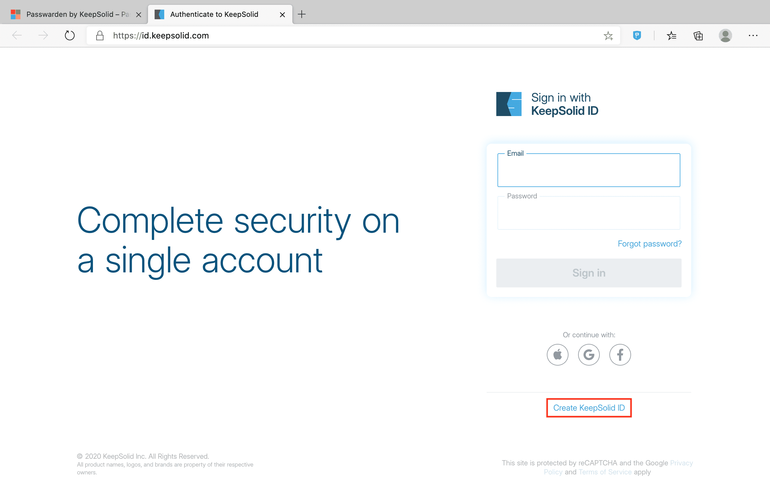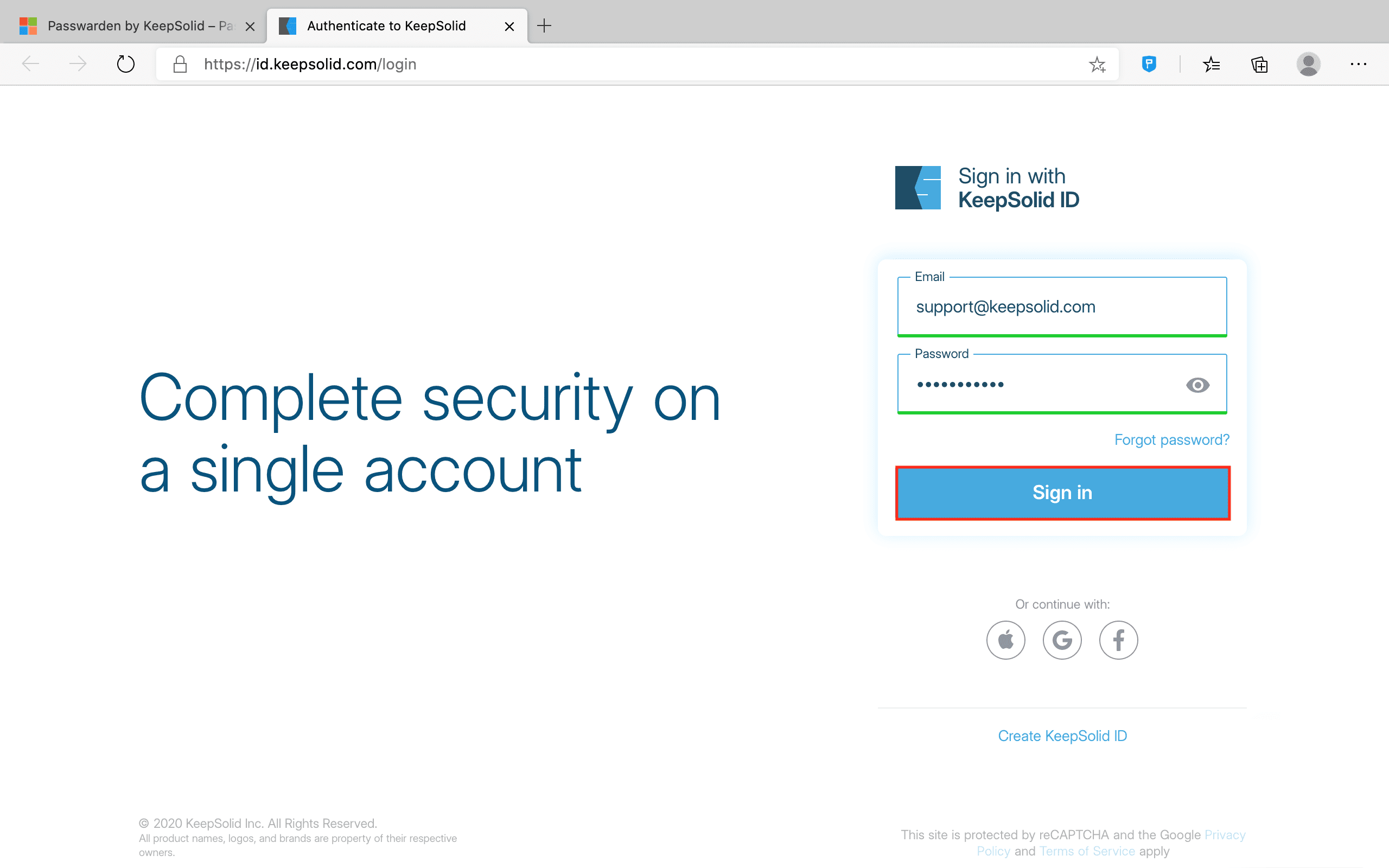 3. Passwardenのウェブアプリケーションが開きます。すでにKeepSolid IDをお持ちの方は、メールアドレスとパスワードを入力してください。その後、Sign in(サインイン)ボタンをクリックします。