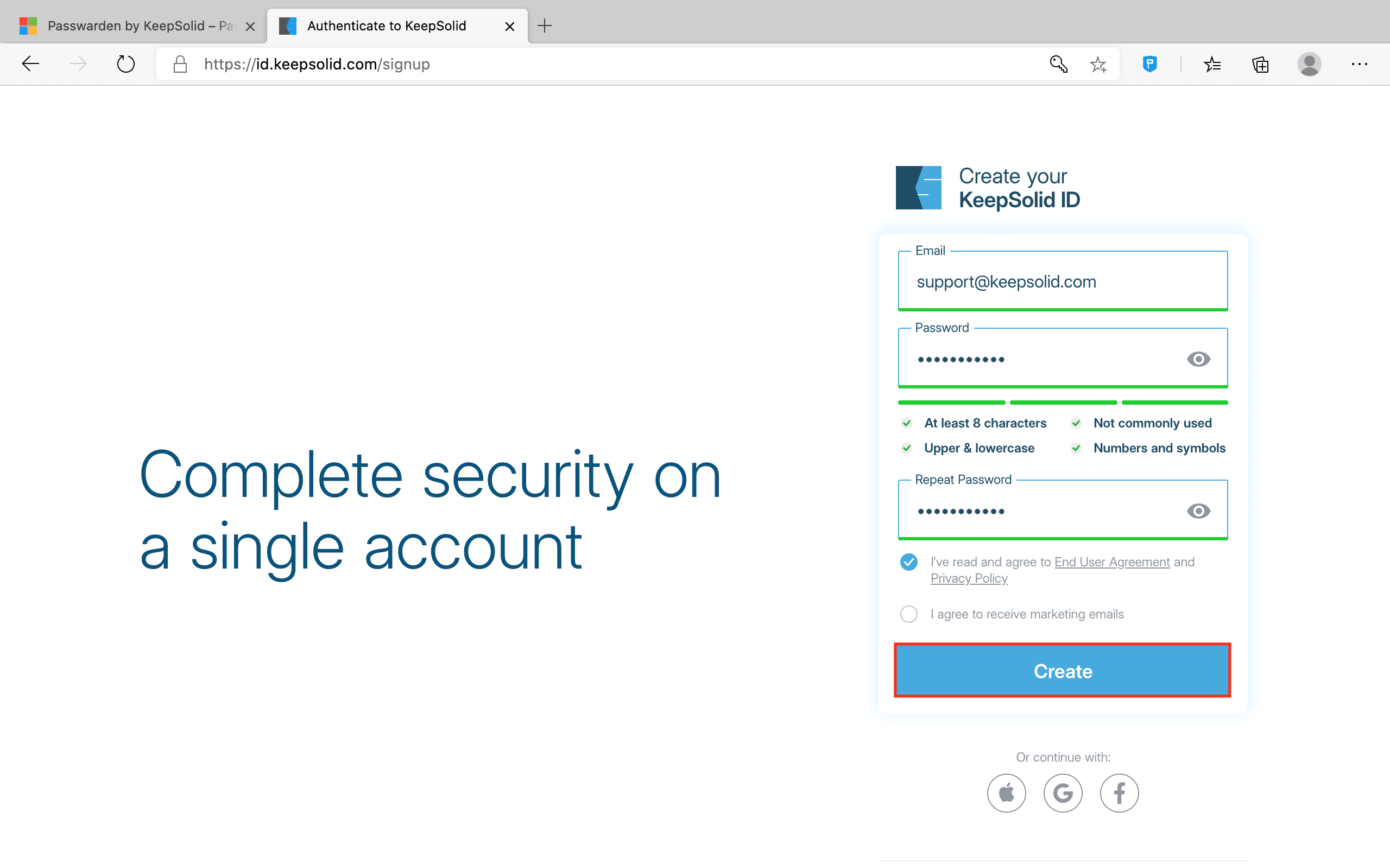 また、KeepSolid IDを新規に作成することも可能です。そのためには、Create KeepSolid ID(KeepSolid IDの作成)をクリックし、Eメールを入力し、パスワードを設定します。I've read and agree to...(続けることで規約に同意します)にチェックを入れ、Create(作成)をクリックします。