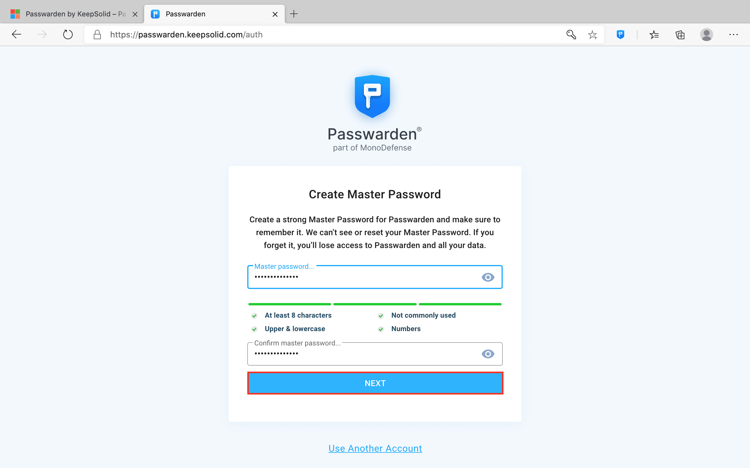 4. マスターパスワード(Passwardenストレージにアクセスするためのパスワード)を設定し、確認します。Next(次へ)をクリックして次に進みます。