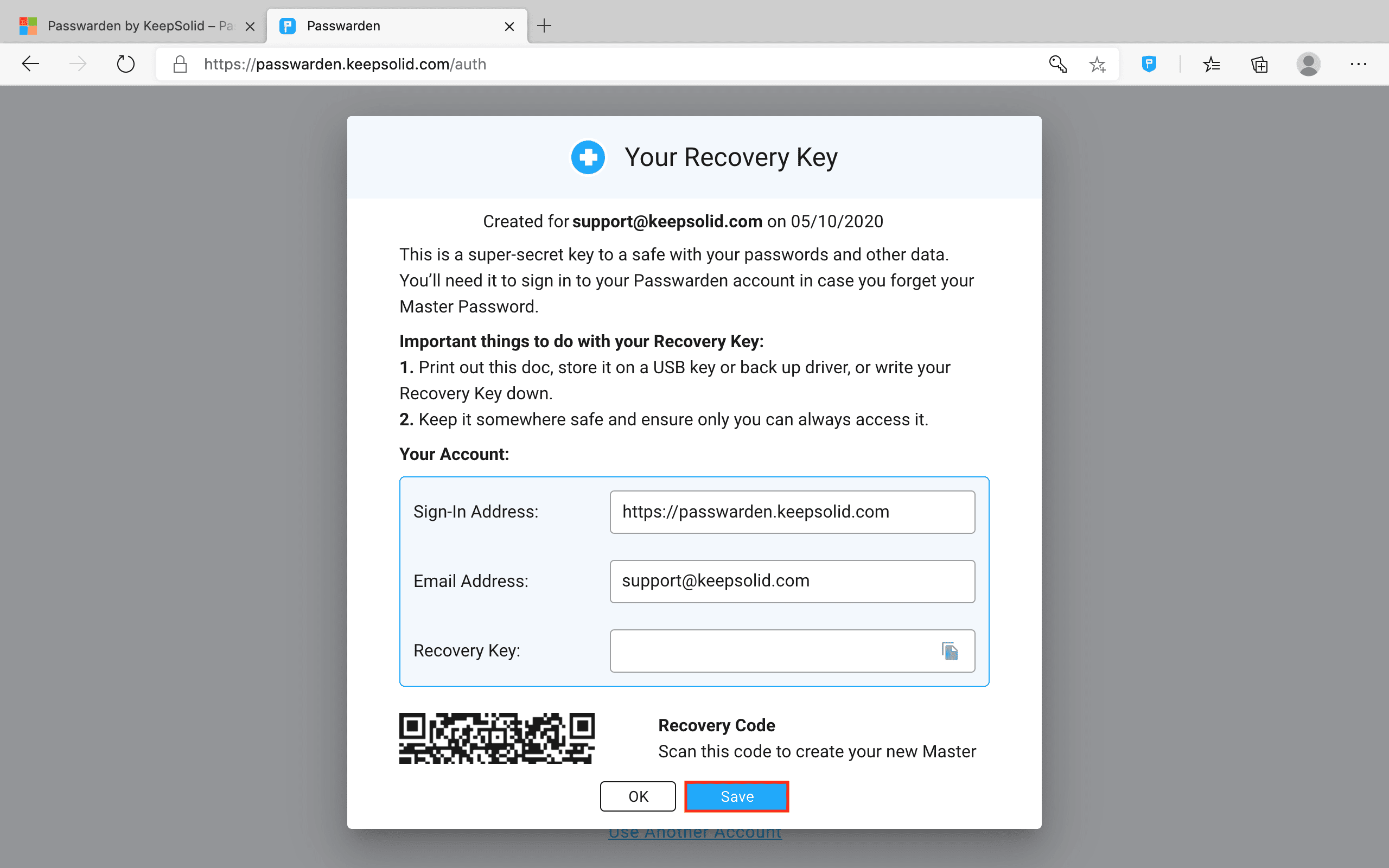 注:マスターパスワードを忘れた場合、Passwardenのアカウントにサインインするために、この回復キーが必要になります。必ず安全な場所に保存してください。