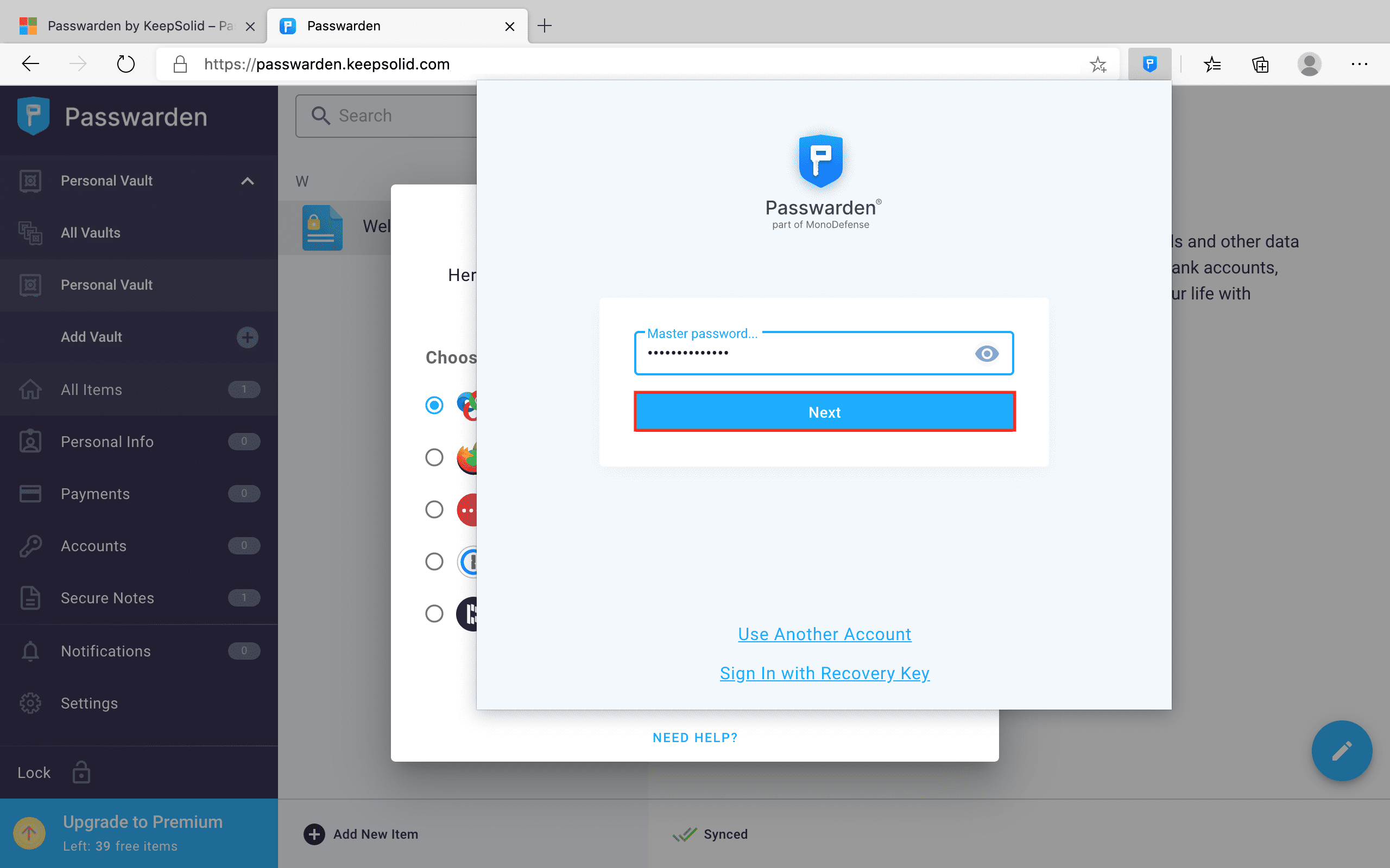 6. これで完了です。Passwardenエクステンションを開き、マスターパスワードを使ってロックを解除します。