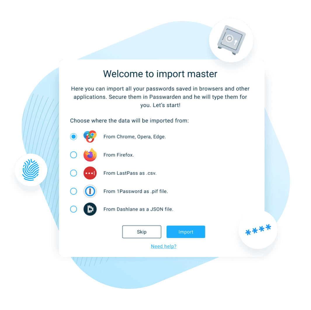 For instance, you can export your Chrome passwords or Dashlane data and move it all right into our password management app. The data migration process automatically matches different types of information and presents it in a ready-to-use form in Passwarden.