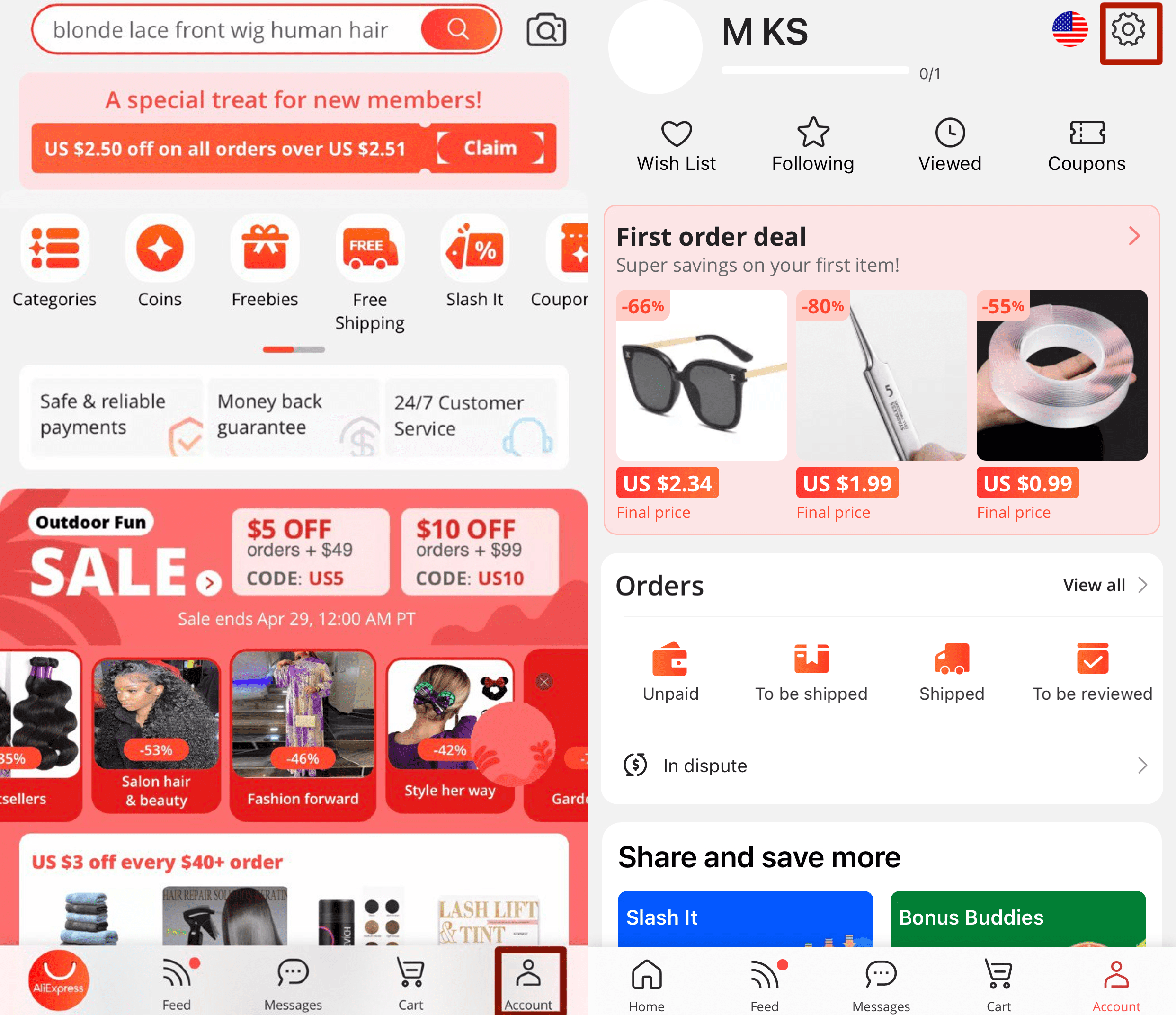 1. Откройте приложение AliExpress на своем телефоне. Вы увидите значок учетной записи в правом нижнем углу экрана.
