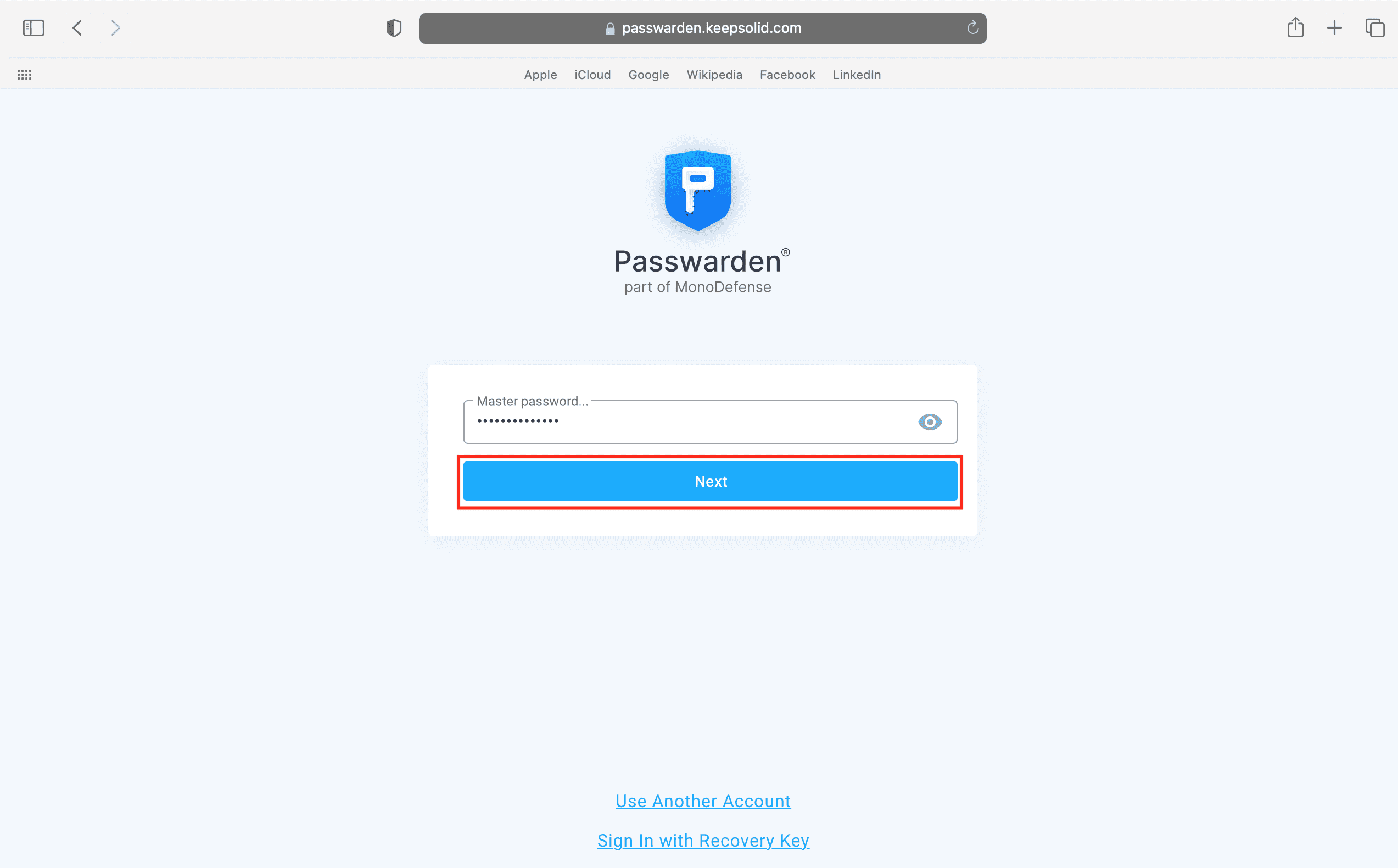 1. Введите мастер-пароль для доступа к учетной записи Passwarden.